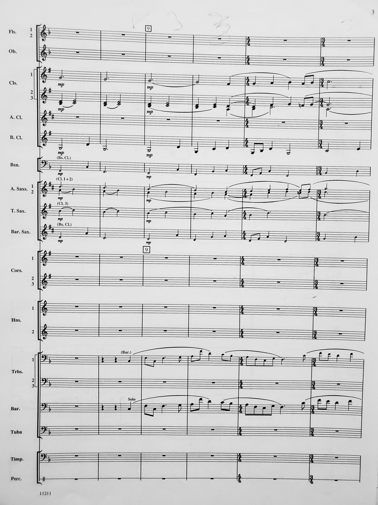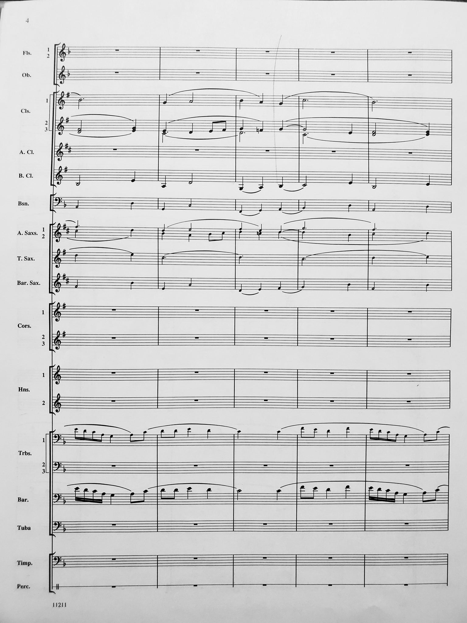 Instrumentation: score; 5-flute 1; 5-flute 2; 2-oboe; 4-clarinet 1; 4-clarinet 2; 4-clarinet 3; 1-alto clarinet; 2-bass clarinet; 2-bassoon; 2-alto sax 1; 2-alto sax 2; 2-tenor sax; 1-bari sax; 3-trumpet 1; 3-trumpet 2; 3-trumpet 3; 2-horn 1; 2-horn 2; 2-tromobne 1; 2-trombone 2; 2-trombone 3; 2-baritone TC; 2-baritone BC; 4-tuba; 1-timpani; 1-percussion