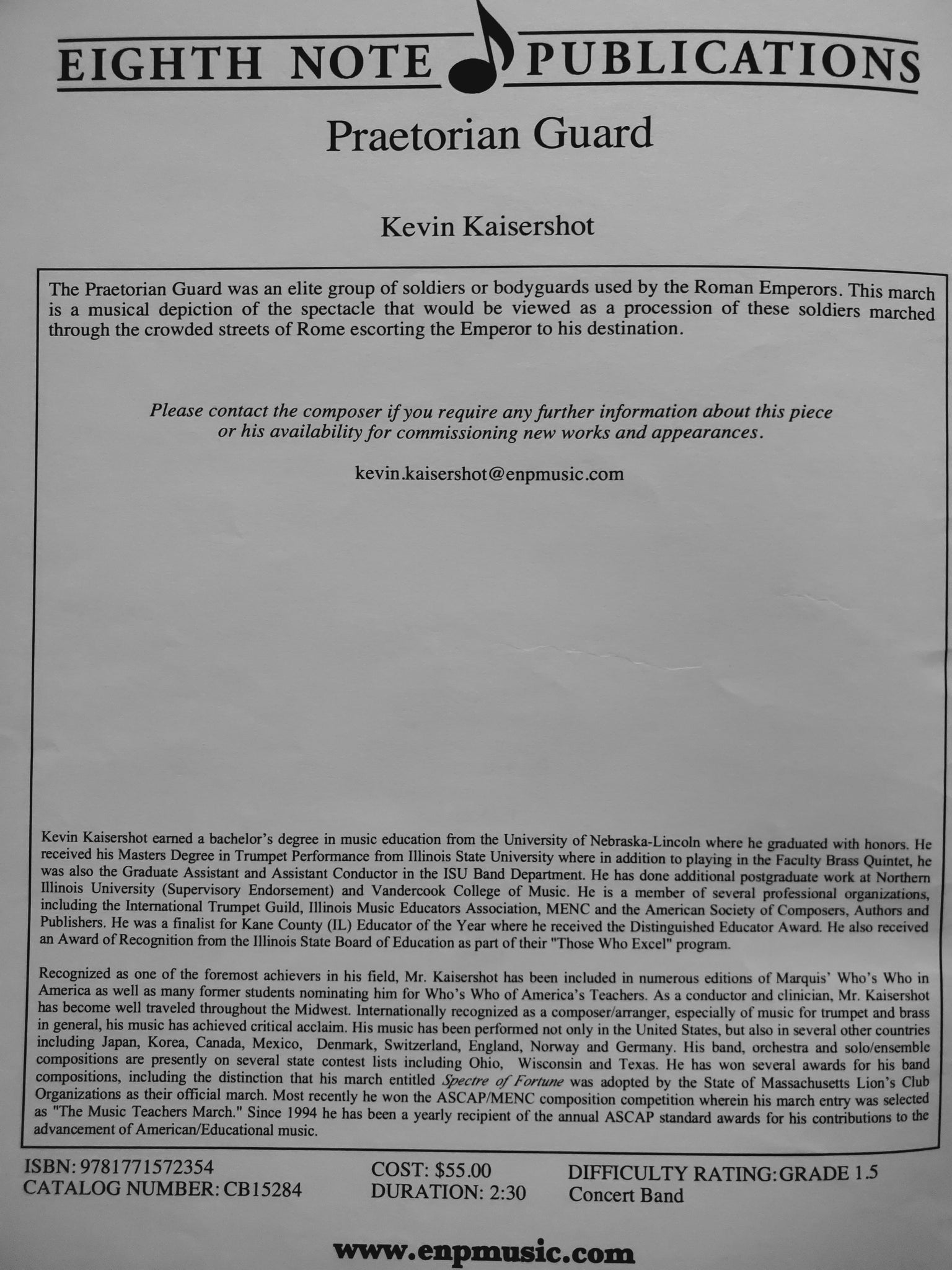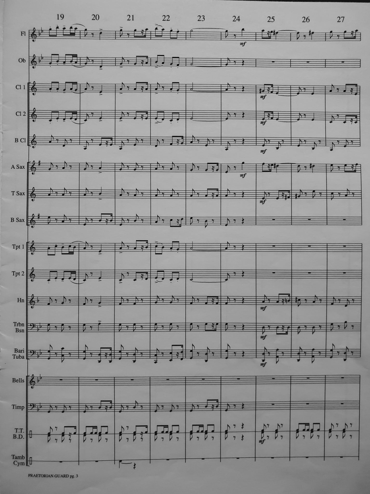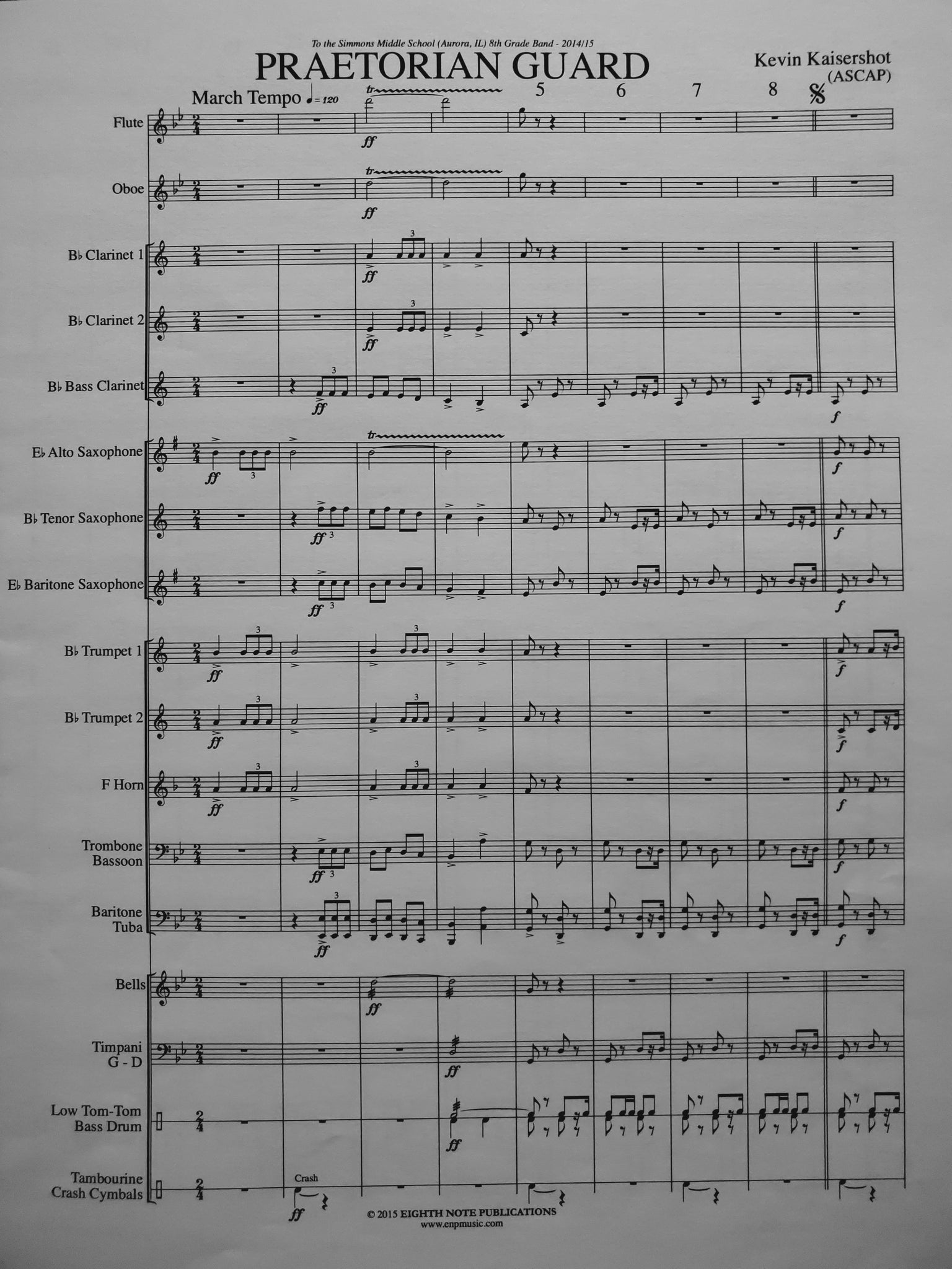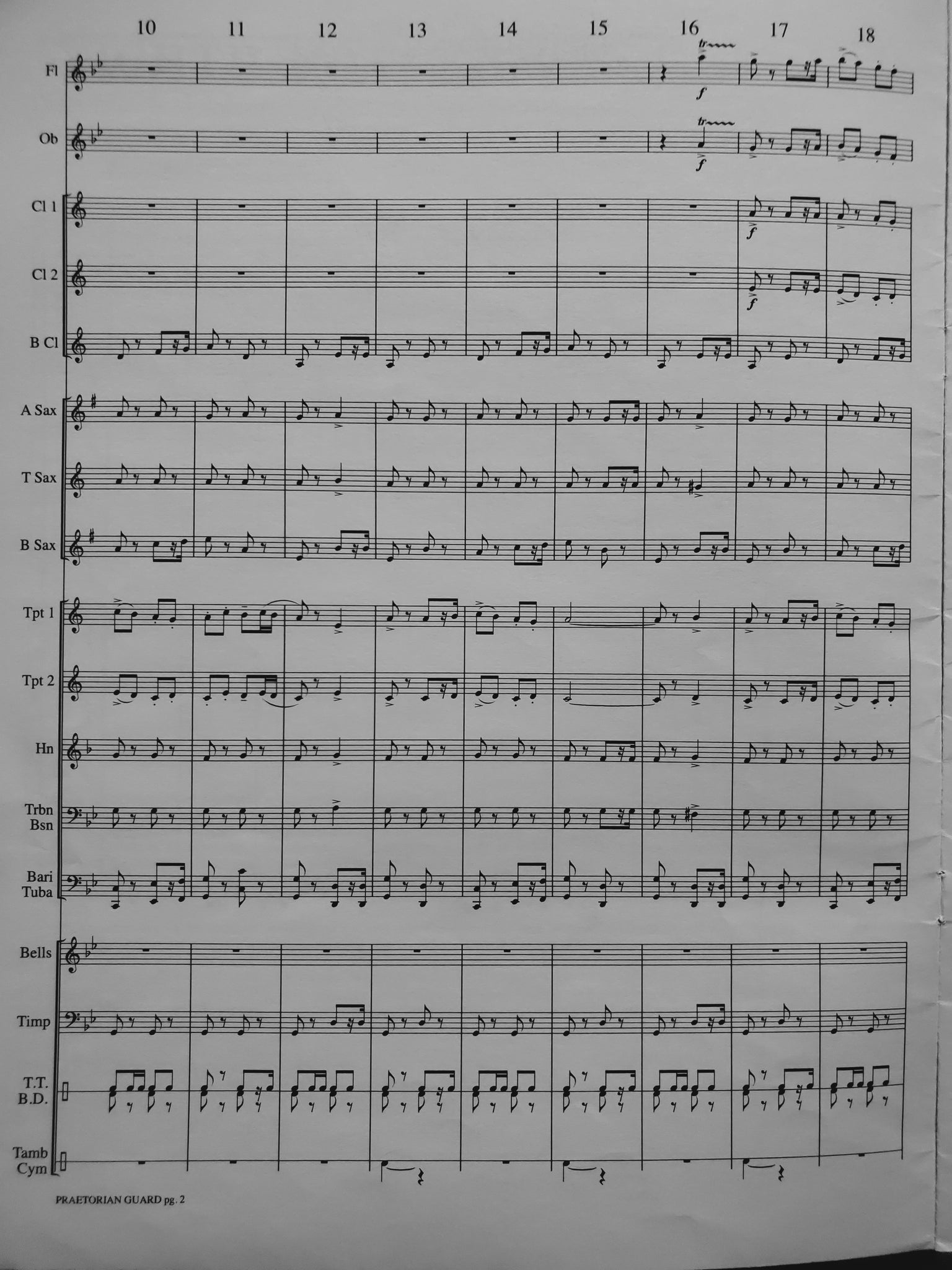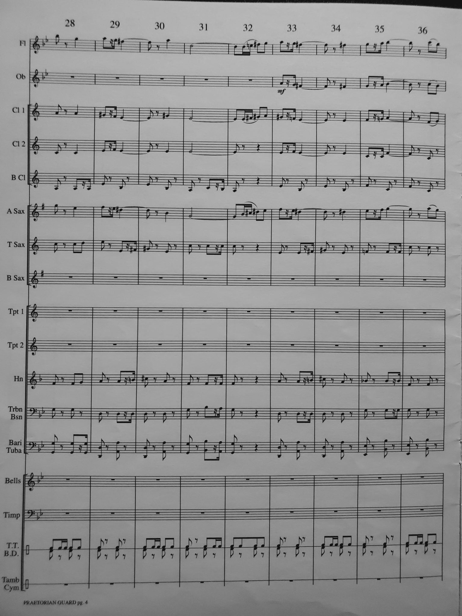 Instrumentation: score; 8-flute; 2-oboe; 4-clarinet 1; 4-clarinet 2; 1-bass clarinet; 4-alto sax; 2-tenor sax; 1-bari sax; 2-trumpet 1; 2-trumpet 2; 2-horn; 4-trombone/bassoon; 2-baritone BC; 2-baritone TC; 2-tuba; 1-string bass; 1-bells; 1-timpani; 2-low tom-tom, bass drum; 2-tambourine, crash cymbals