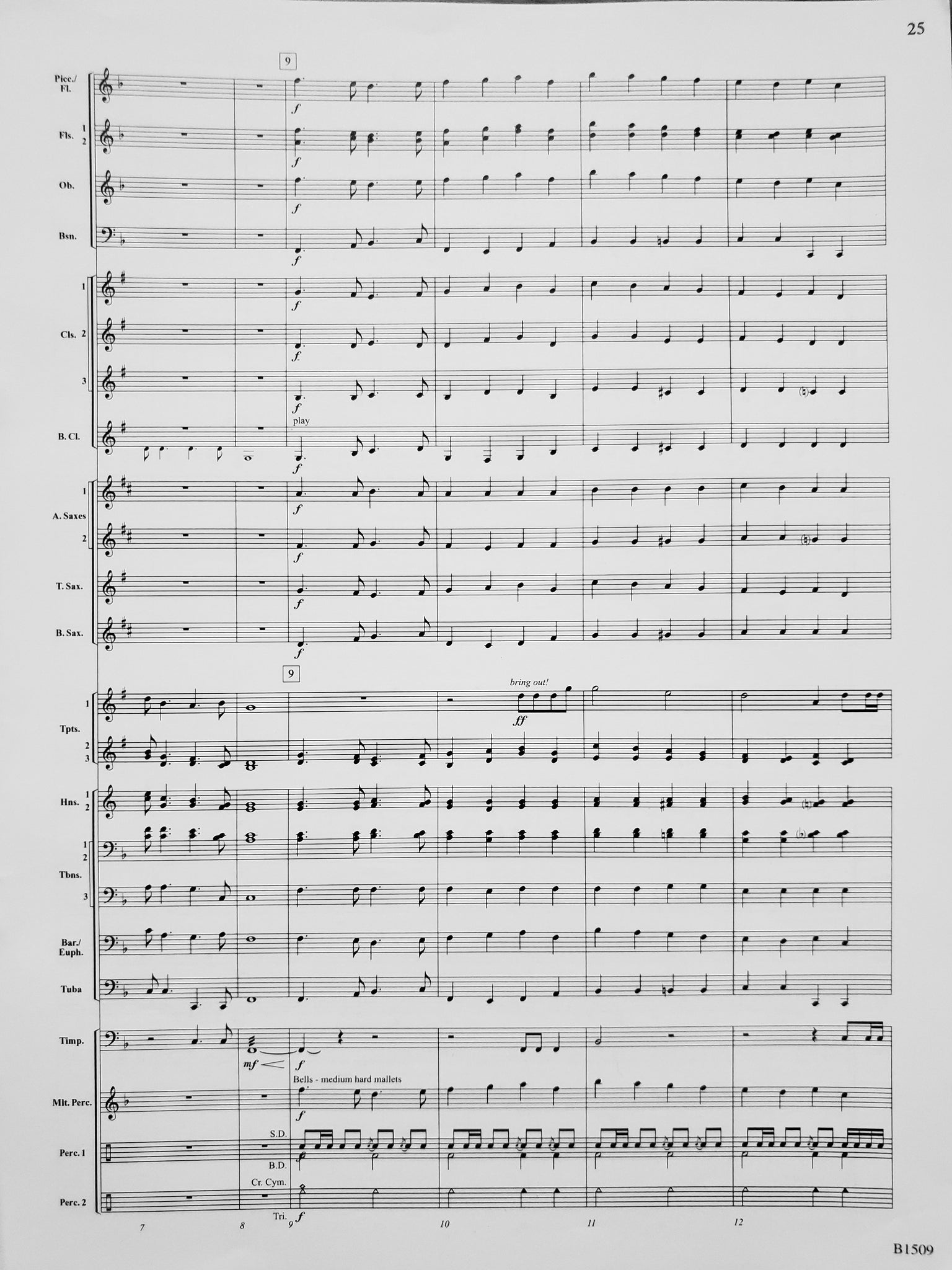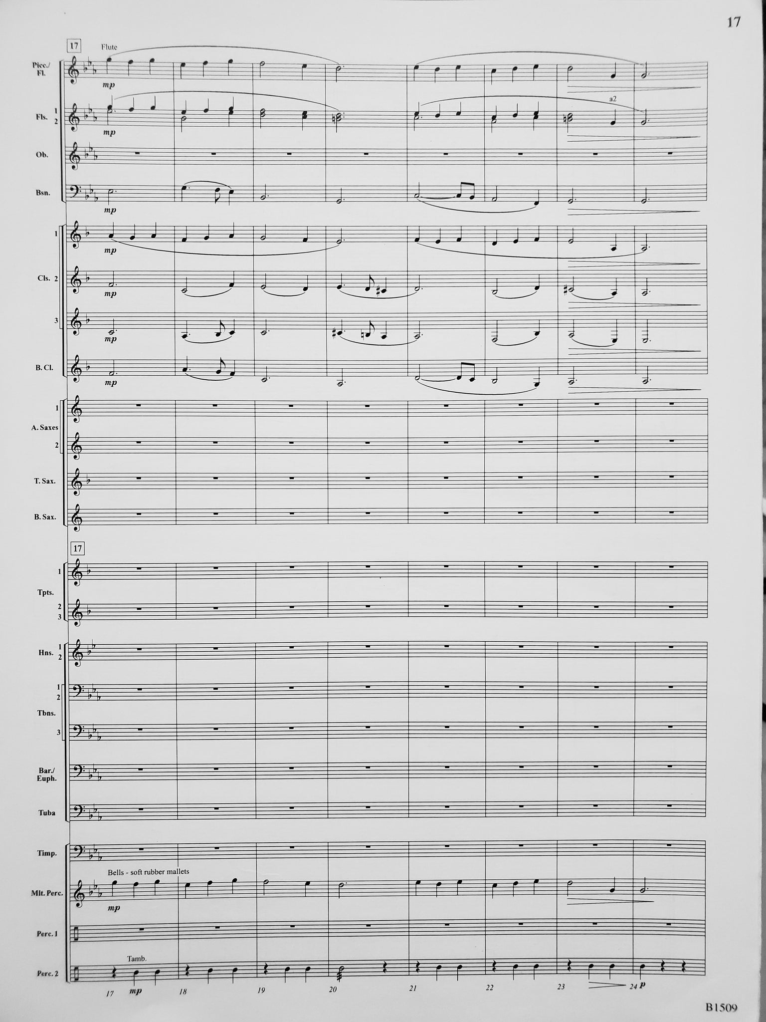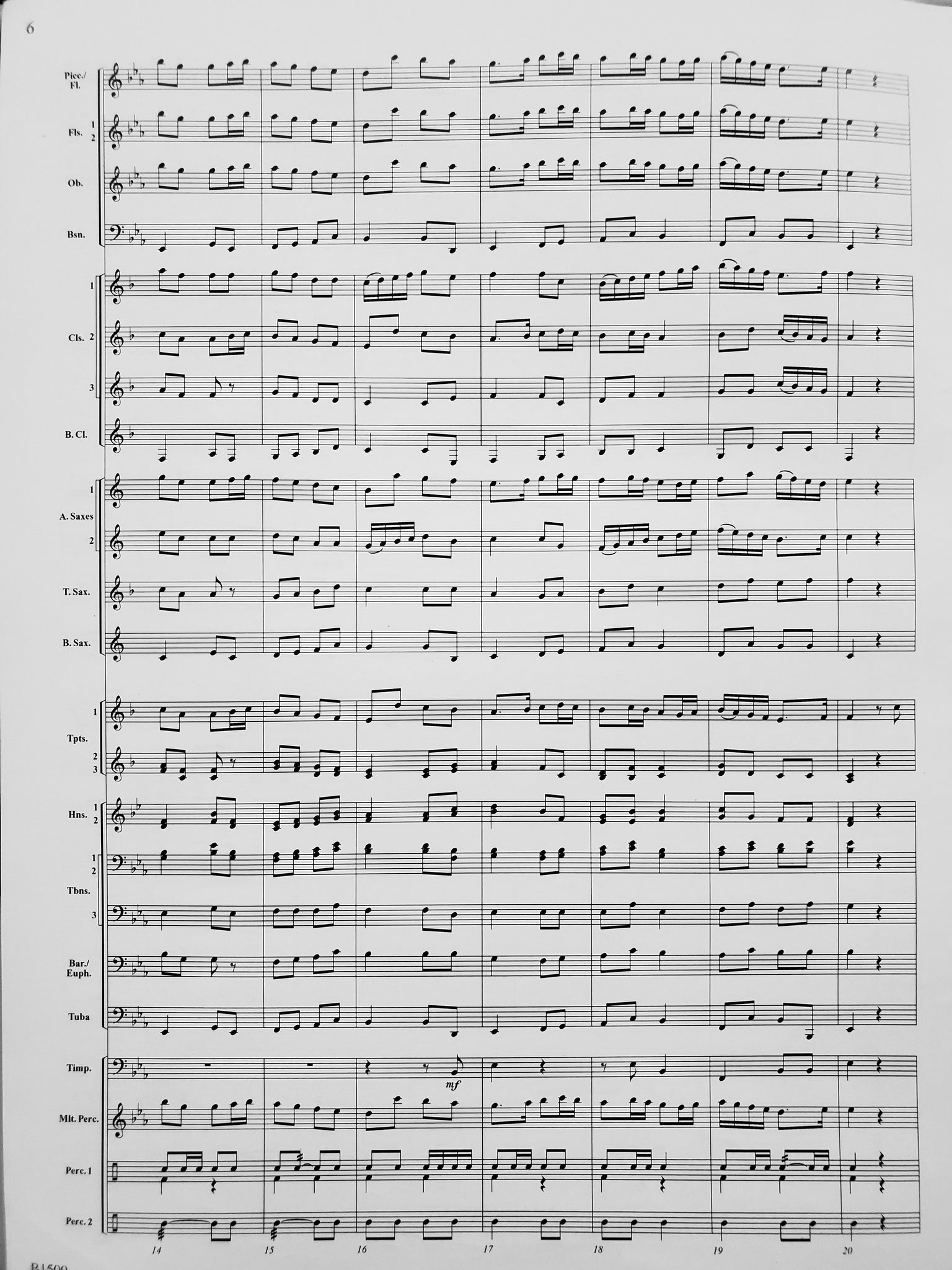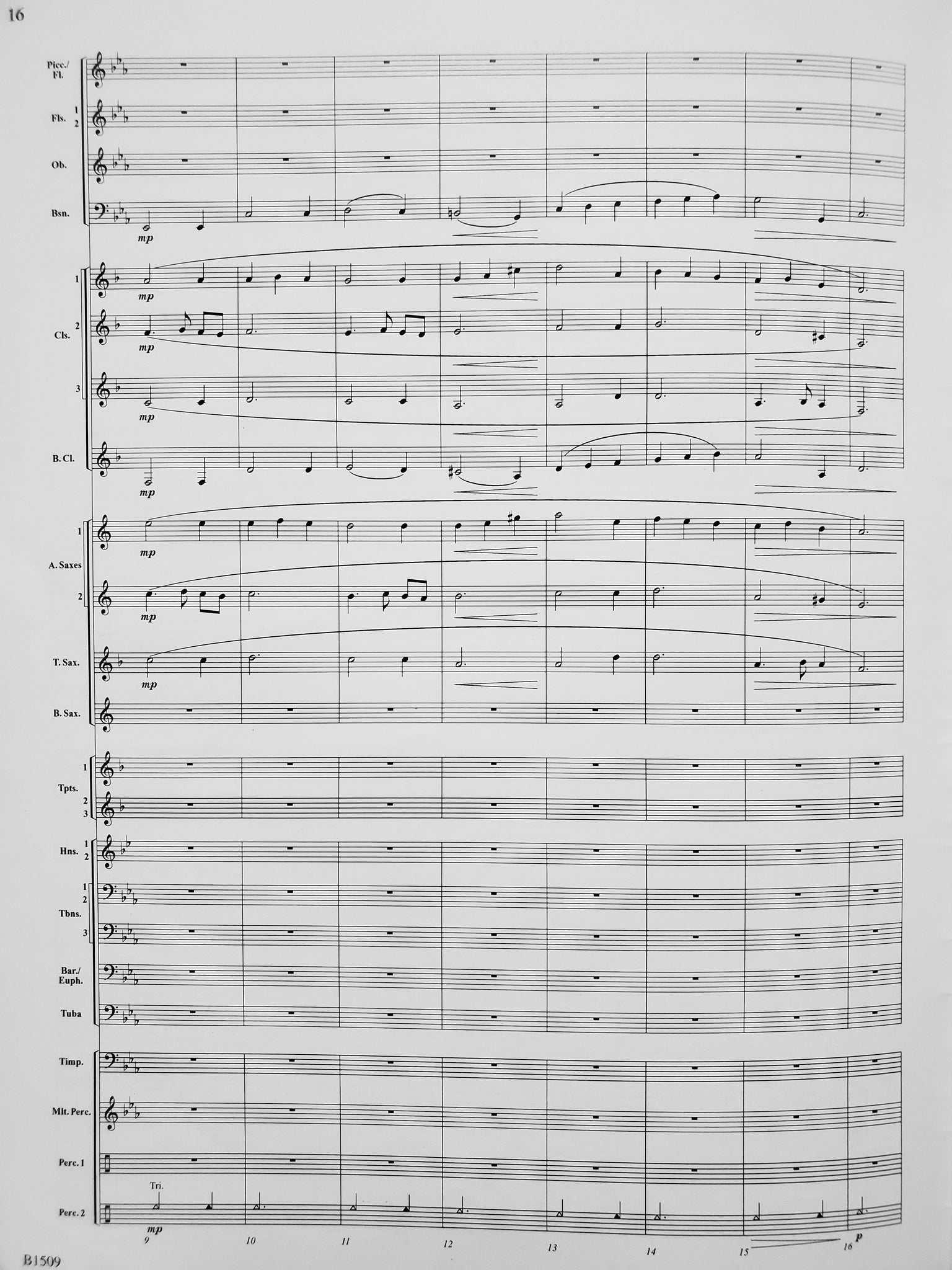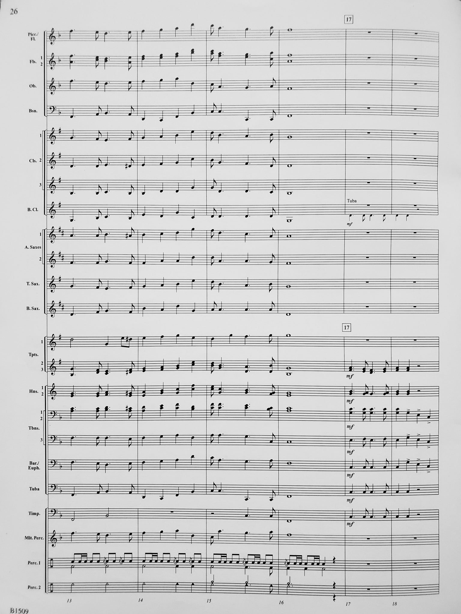 Instrumentation:score; 1-piccolo/flute; 4-flute 1; 4-flute 2; 2-oboe; 2-bassoon; 4-clarinet 1; 4-clarinet 2; 4-clarinet 3; 2-bass clarinet; 2-alto sax 1;2-alto sax 2; 2-tenor sax; 2-bari sax; 3-trumpet 1; 3-trumpet 2; 3-trumpet 3; 2-horn 1; 2-horn 2; 2-trombone 1; 2-trobone 2; 2-trombone 3; 2-baritone/euphonium; 2-beritone TC; 4-tuba; 1-timpani; 2-mallet percussion; 4-percussion 1; 4-percussion 2