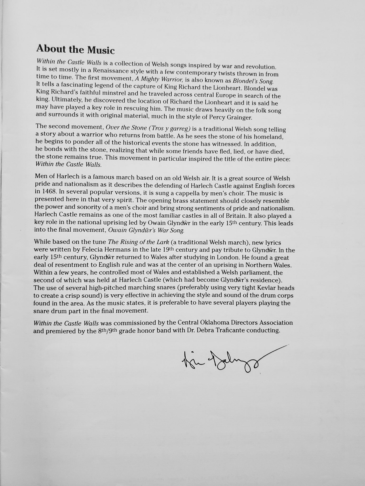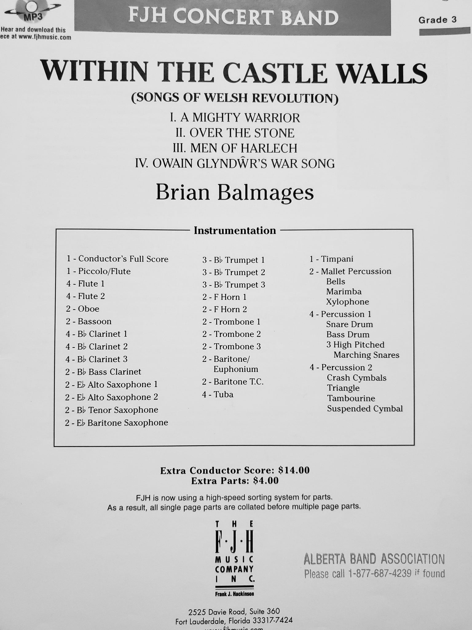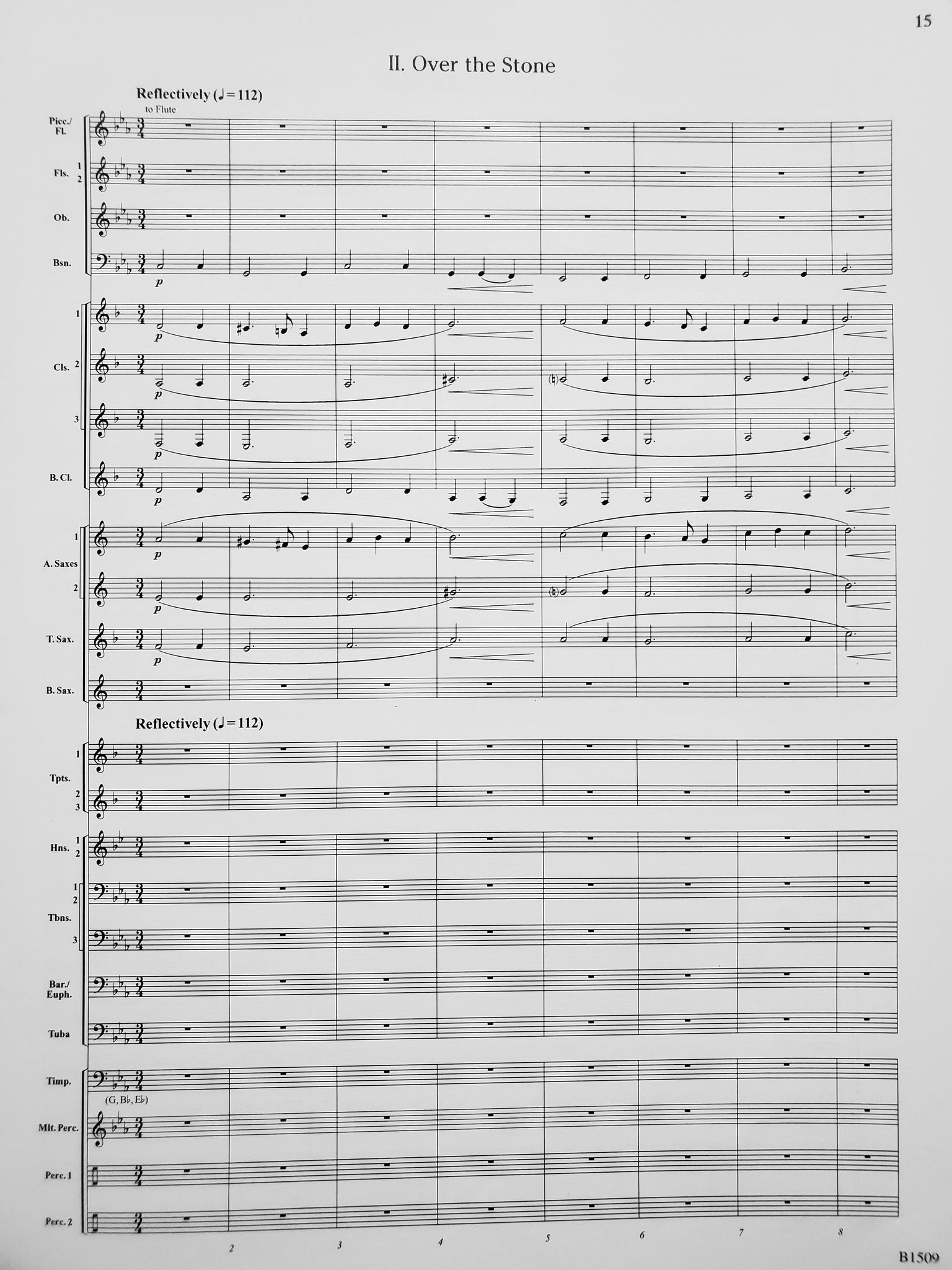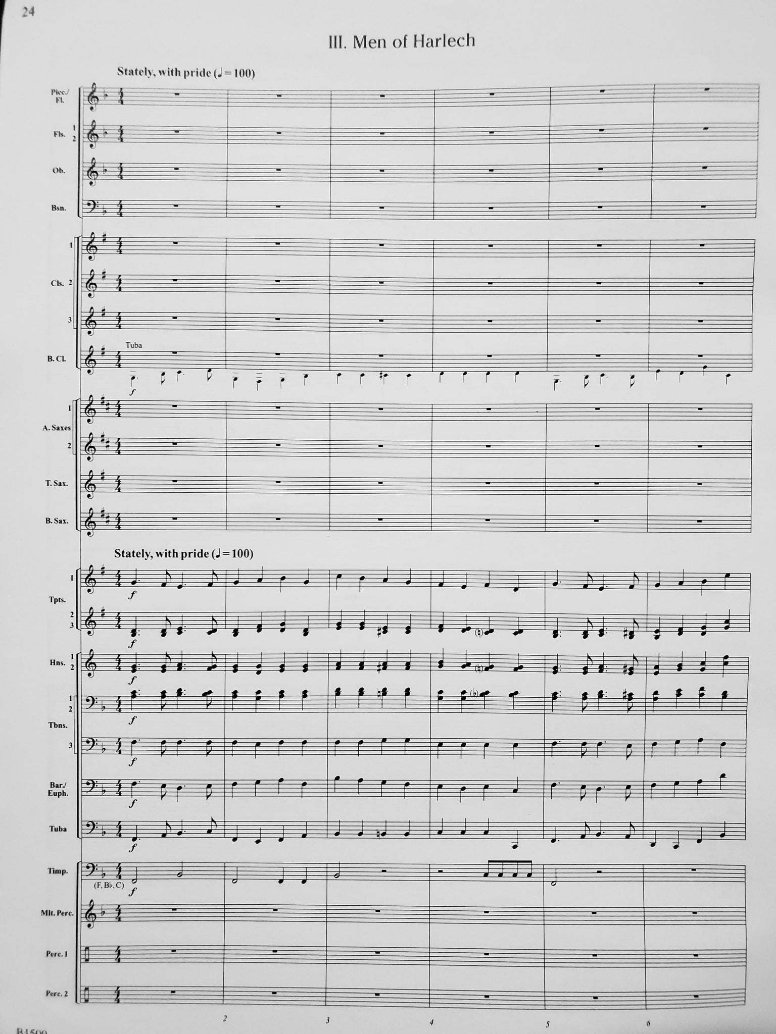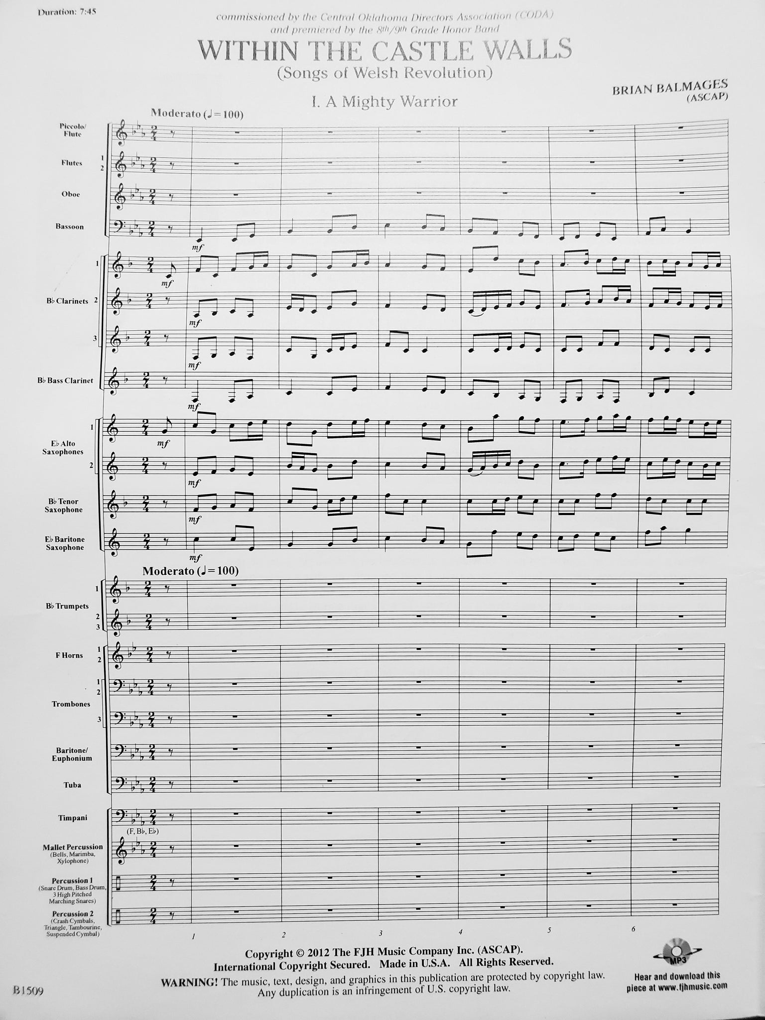 Instrumentation:score; 1-piccolo/flute; 4-flute 1; 4-flute 2; 2-oboe; 2-bassoon; 4-clarinet 1; 4-clarinet 2; 4-clarinet 3; 2-bass clarinet; 2-alto sax 1;2-alto sax 2; 2-tenor sax; 2-bari sax; 3-trumpet 1; 3-trumpet 2; 3-trumpet 3; 2-horn 1; 2-horn 2; 2-trombone 1; 2-trobone 2; 2-trombone 3; 2-baritone/euphonium; 2-beritone TC; 4-tuba; 1-timpani; 2-mallet percussion; 4-percussion 1; 4-percussion 2
