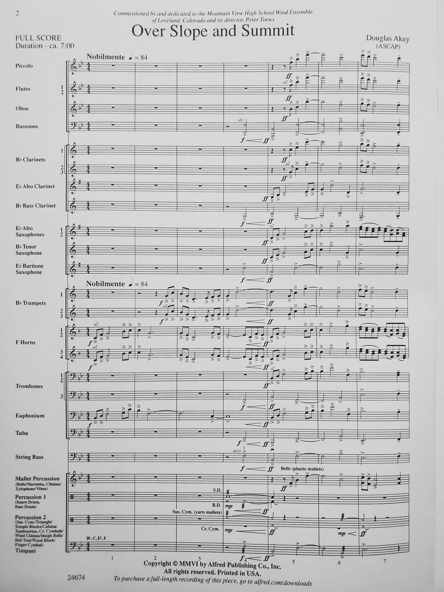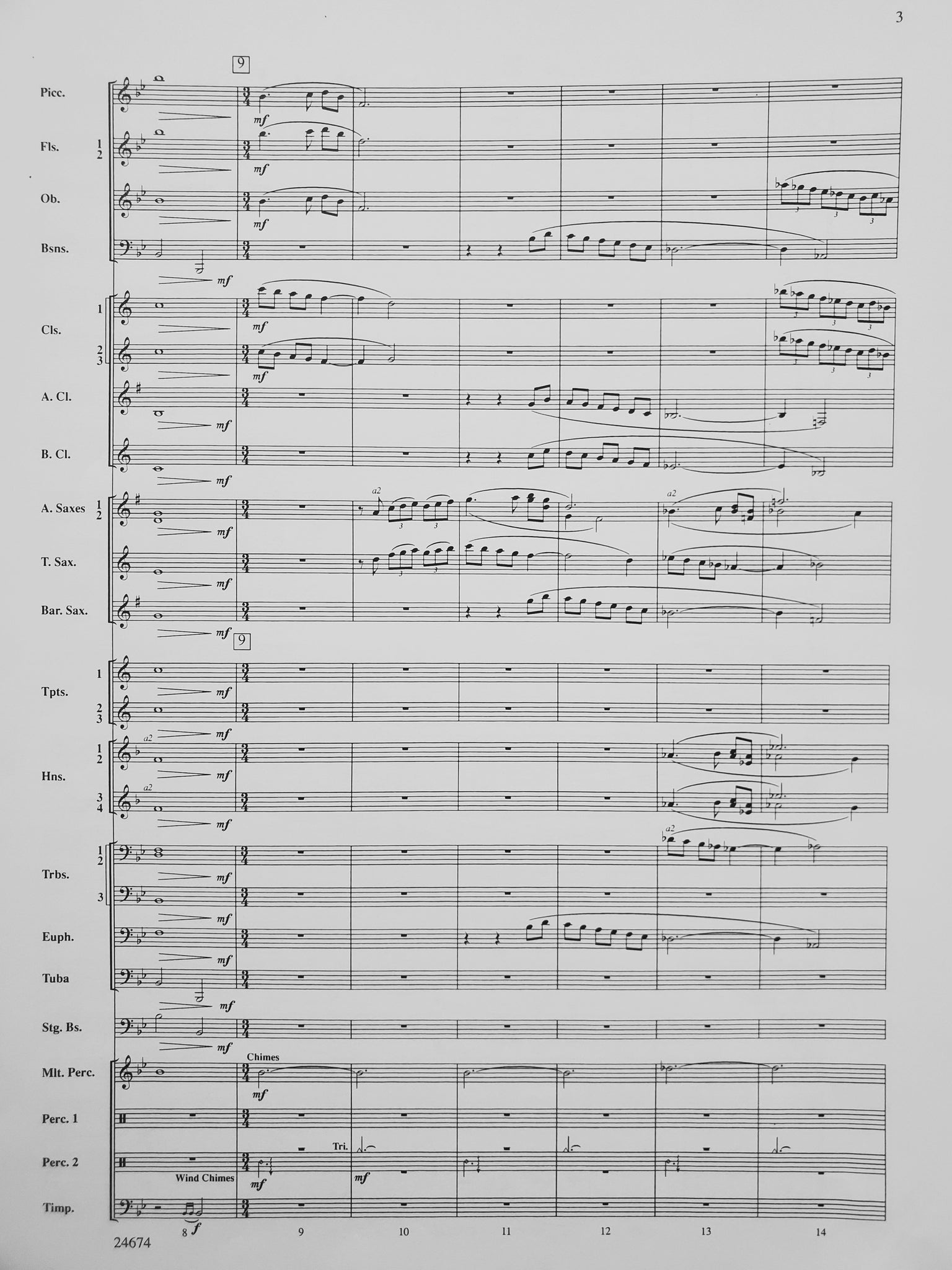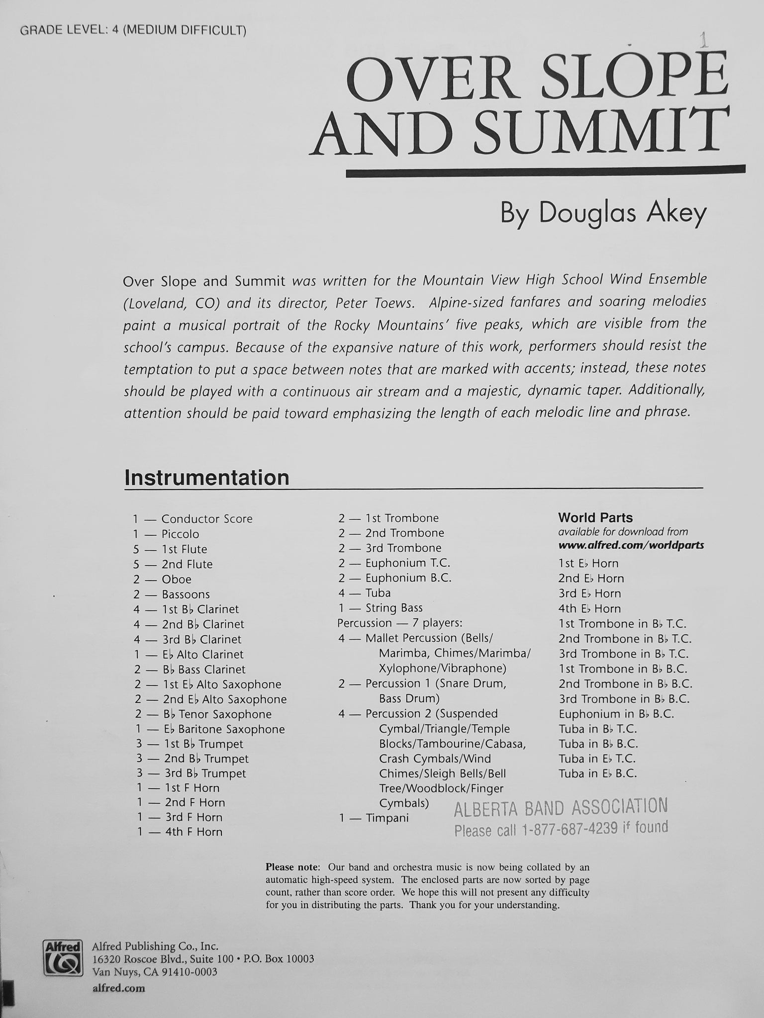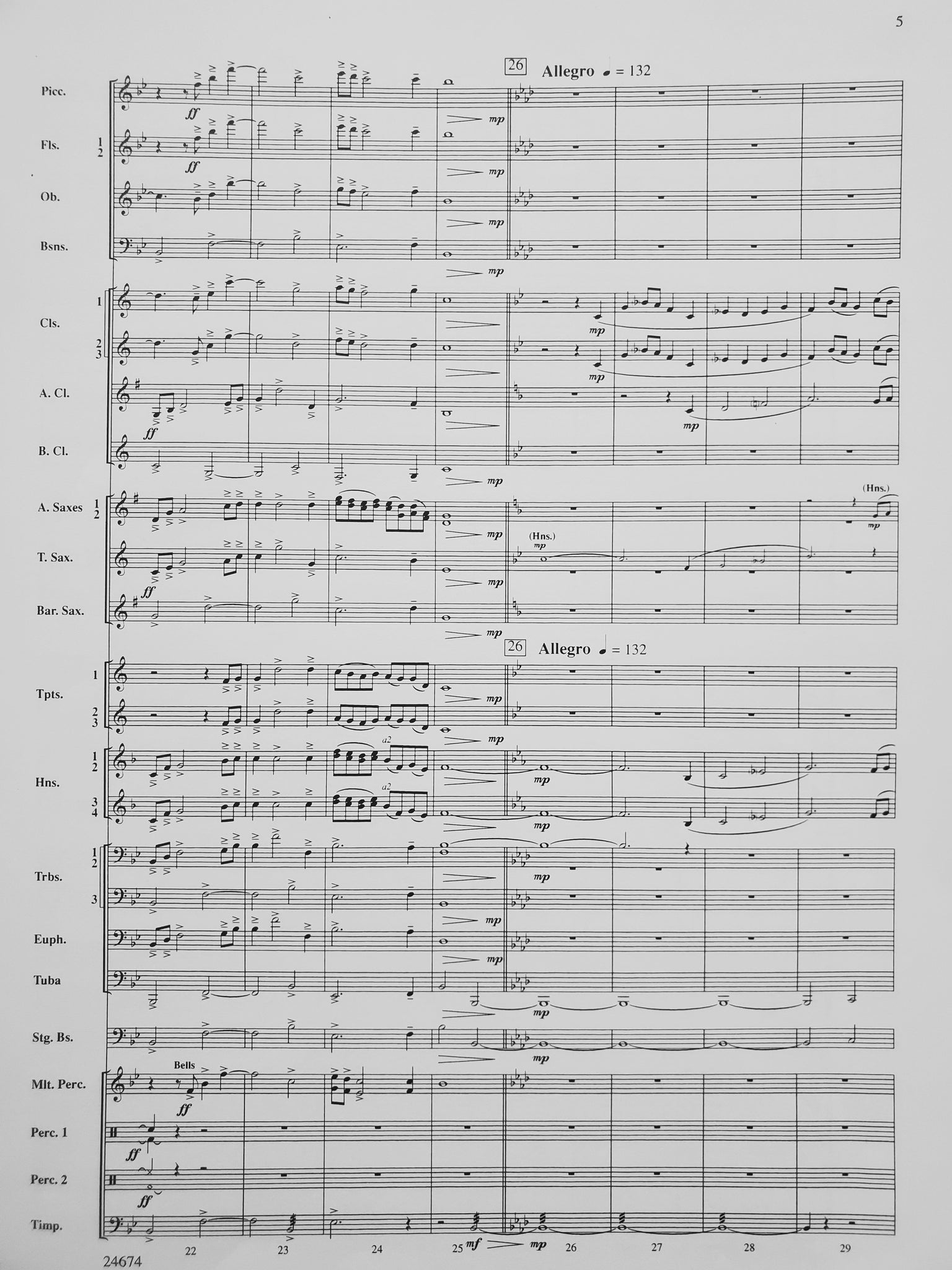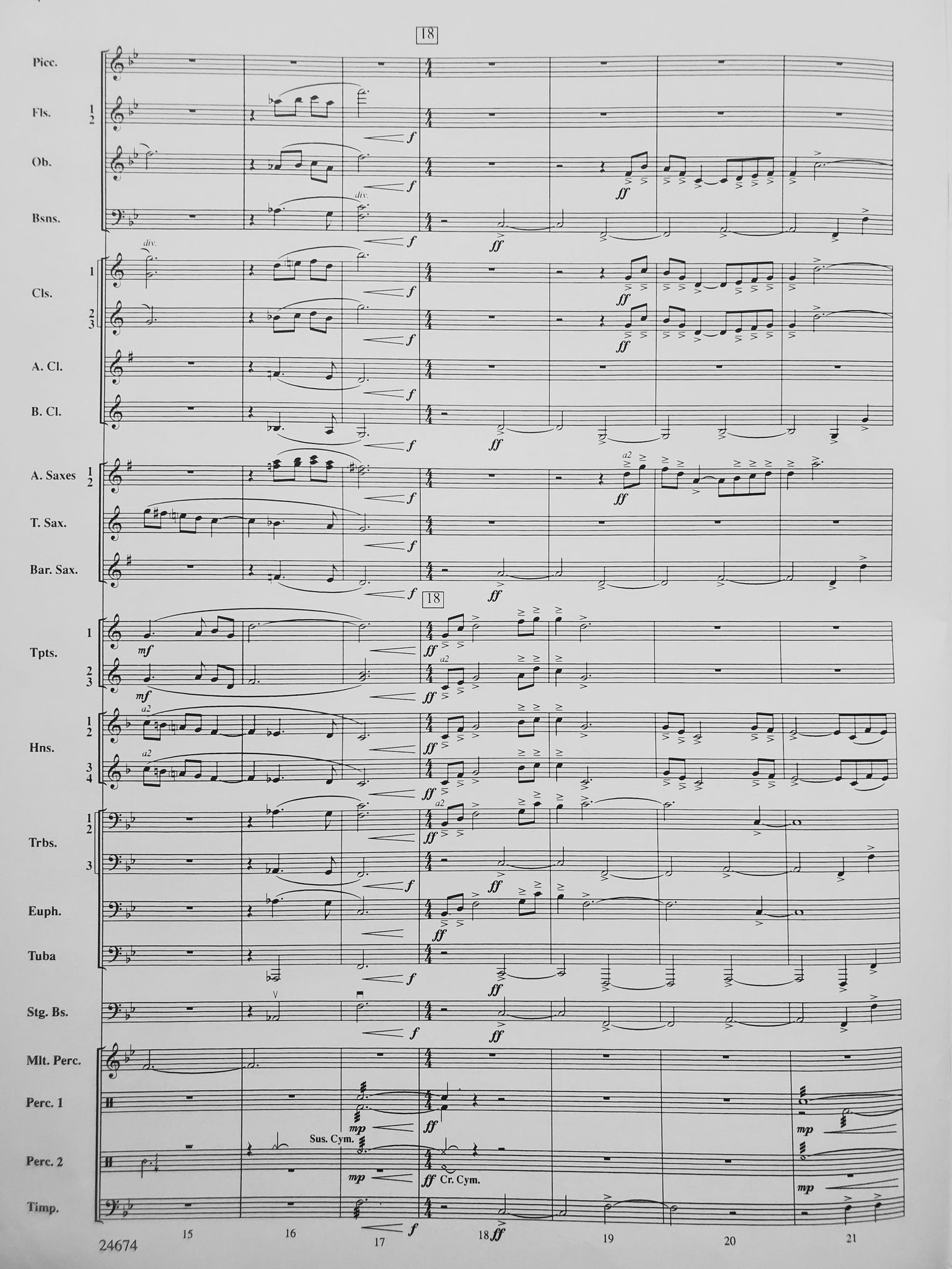 instrumentation: score; 1-piccolo; 5-flute 1; 5-flute 2; 2-oboe; 2-bassoon; 4-clarinet 1; 3-clarinet 2; 4- clarinet 3; 1-alto clarinet; 2-bass clarinet; 2-alto sax 1; 2-alto sax 2; 2-tenor sax; 1-bari sax; 3-trumpet 1; 3-trumpet 2; 3-trumpet 3; 1-horn 1; 1-horn 2; 1-horn 3; 1-horn 4; 2-trombone 1; 2-trombone 2; 2-trombone 3; 2-euphonium BC; 2-euphonium TC; 4-tuba; 1-string bass; 4-mallet percussion; 2-percussion 1; 4-percussion 2; 1-timpani
