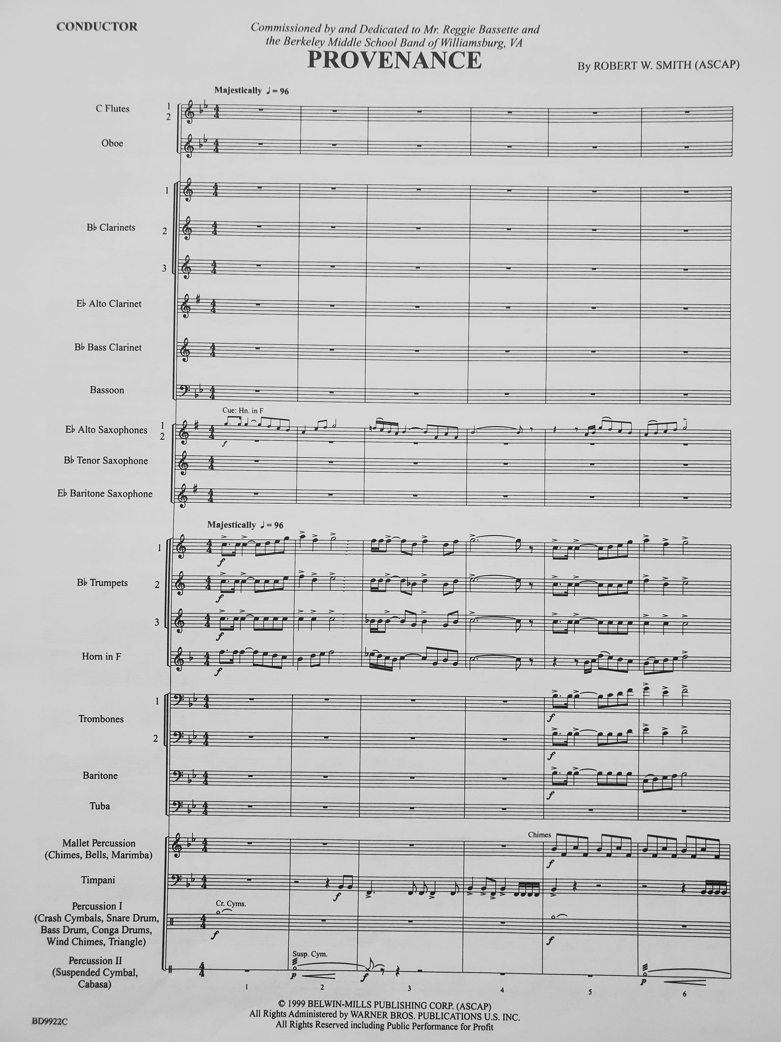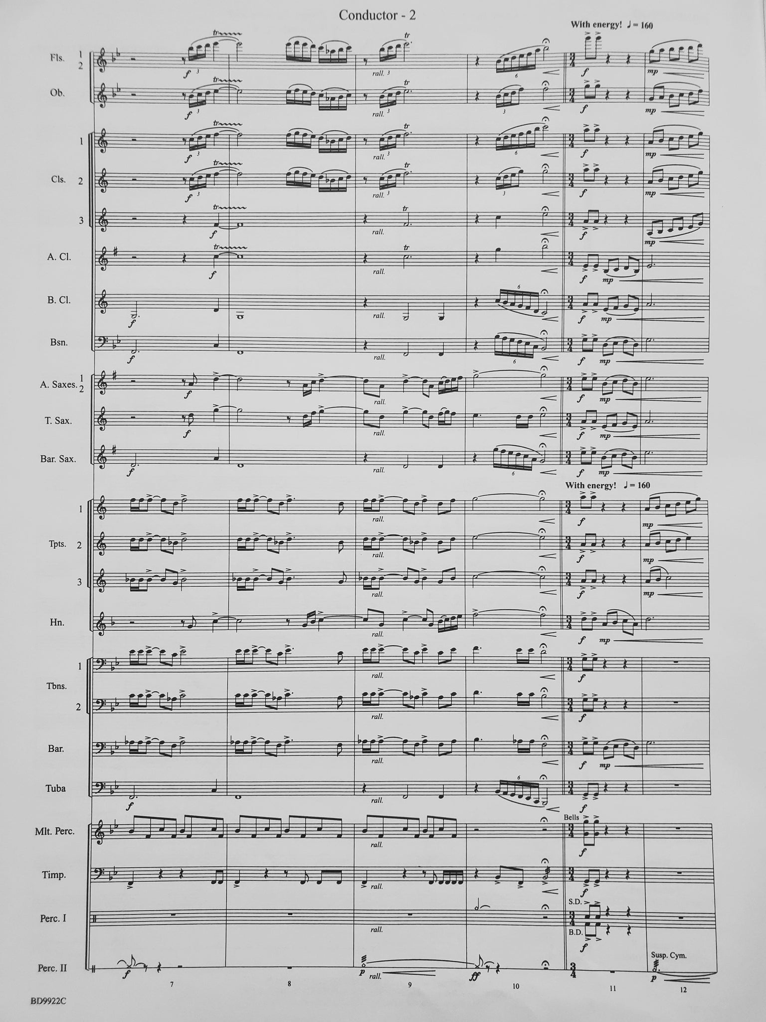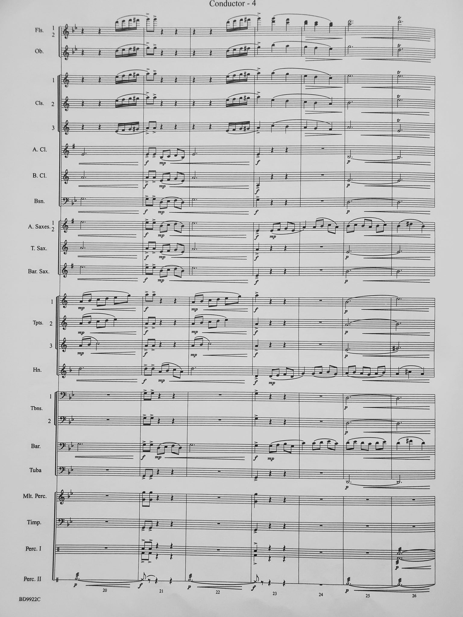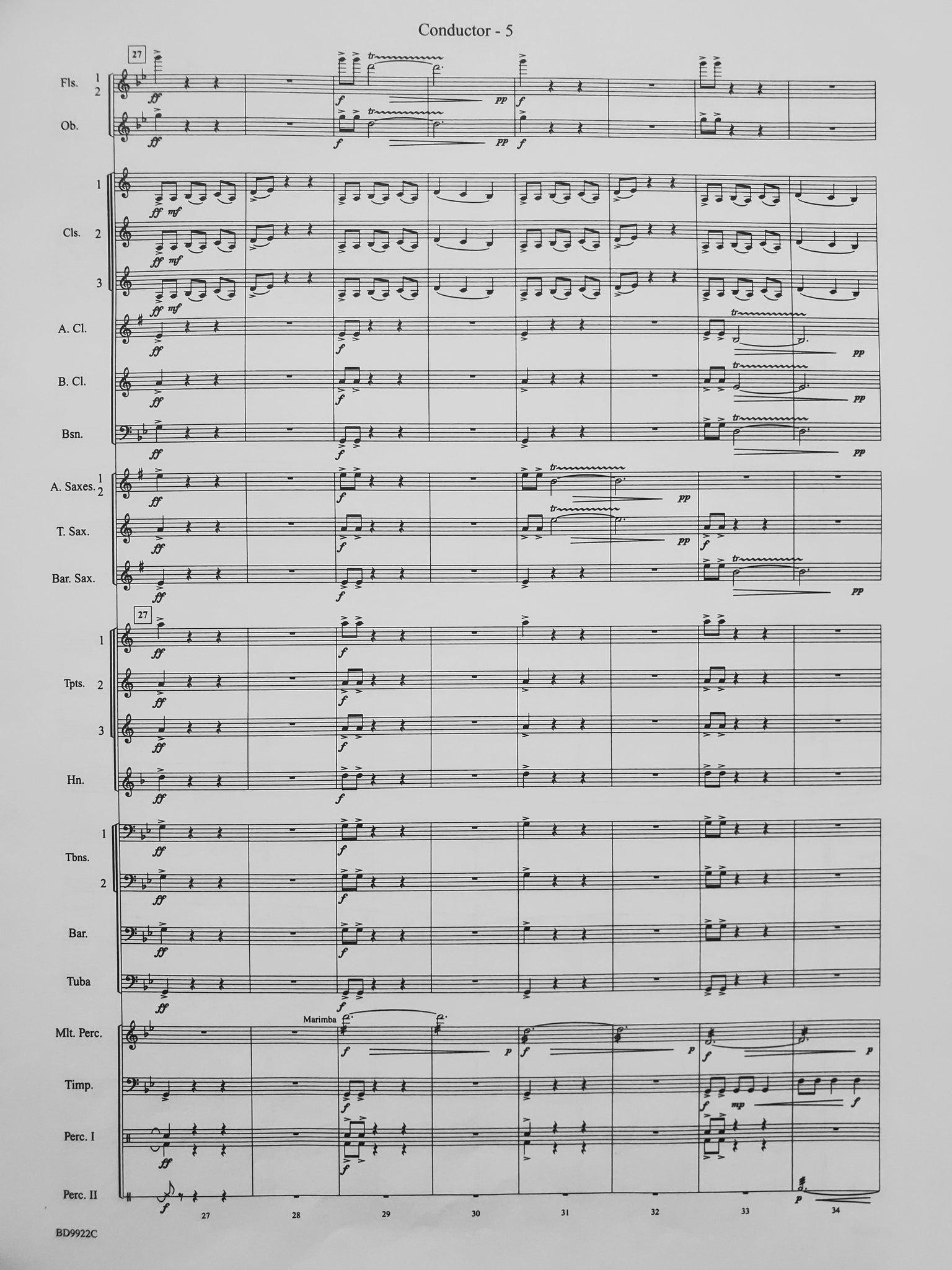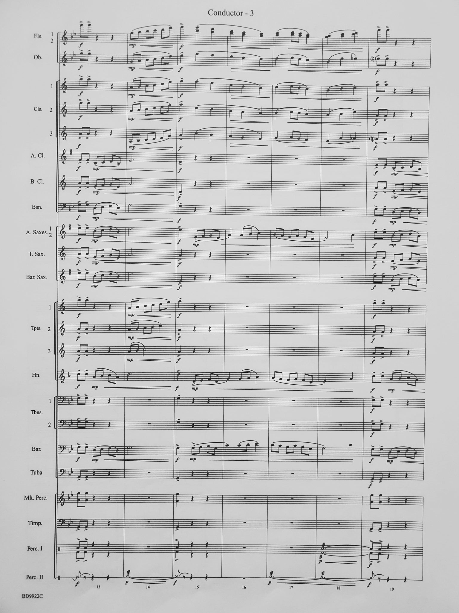 Instrumentation: score; 6-flute 1 and 2; 2-oboe; 3-clarinet 1; 3-clarinet 2; 3-clarinet 3; alto clarinet; bass clarinet; bassoon; 2-alto sax 1 and 2; tenor sax; bari sax; 2-trumpet 1; 2-trumpet 2; 2-trumpet 3; 4-horn; 2-trombone 1; 2-trombone 2; 2-baritone BC; 2-baritone TC; 4-tuba; 3-mallet percussion; timpani; 4-percussion 1; 2-percussion 2