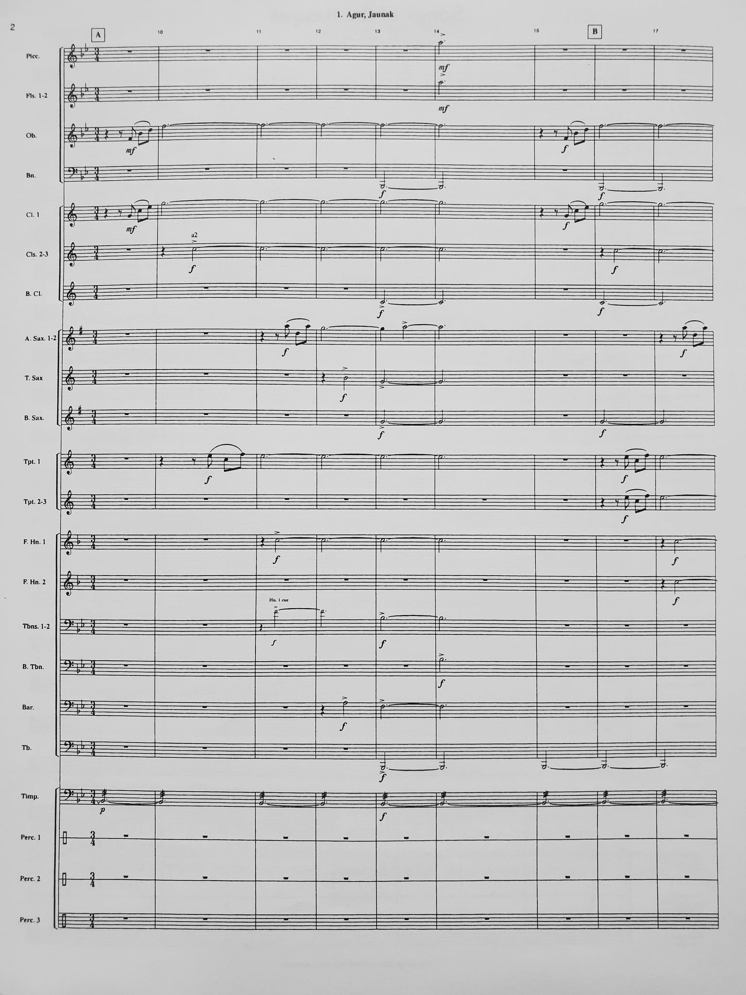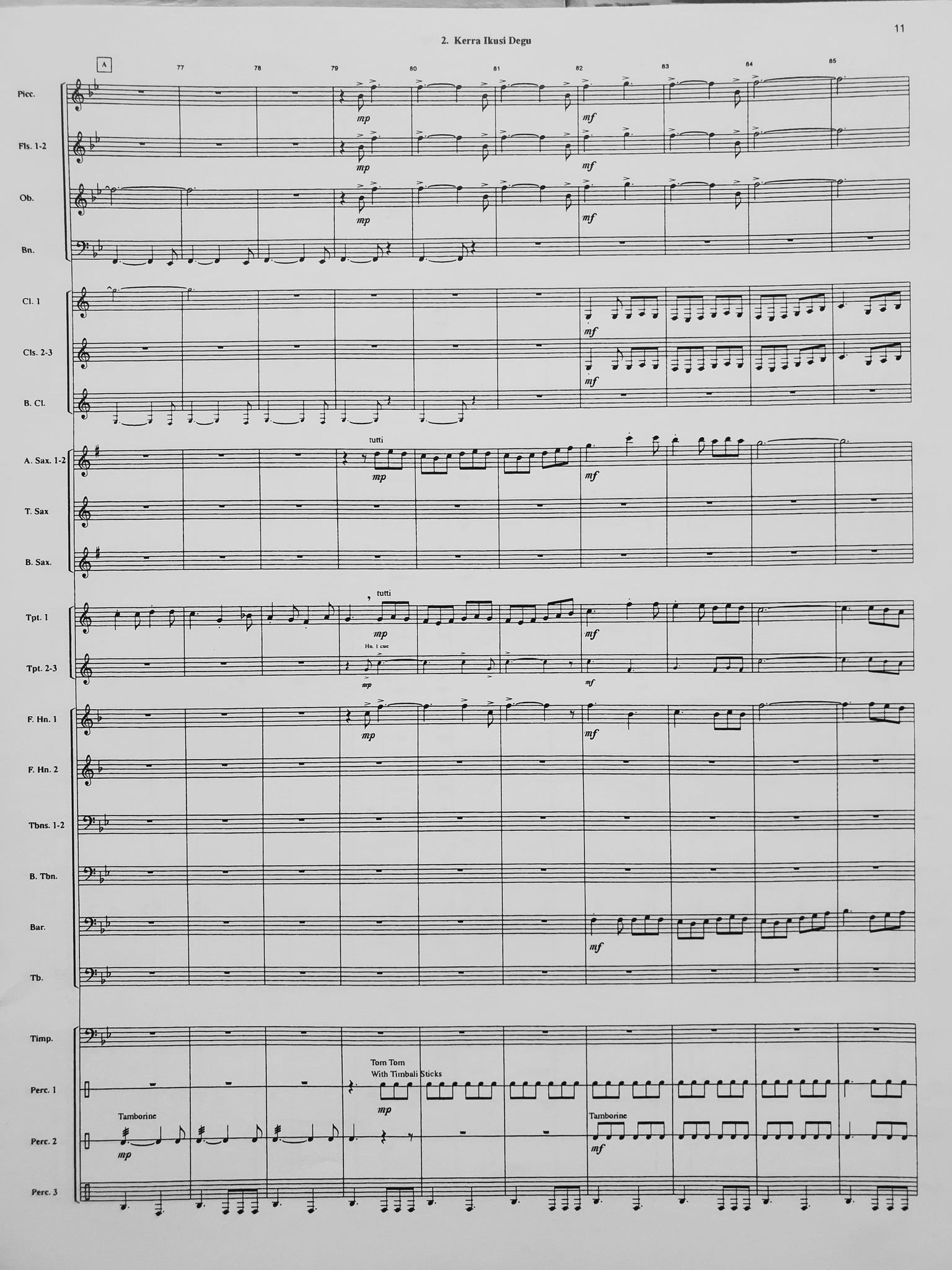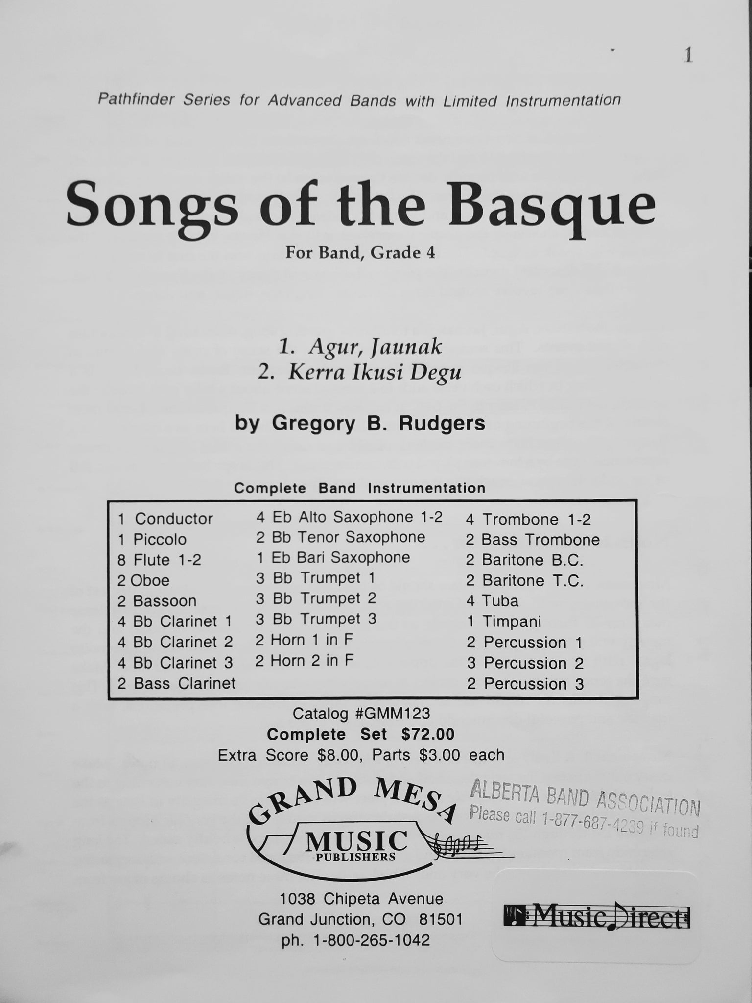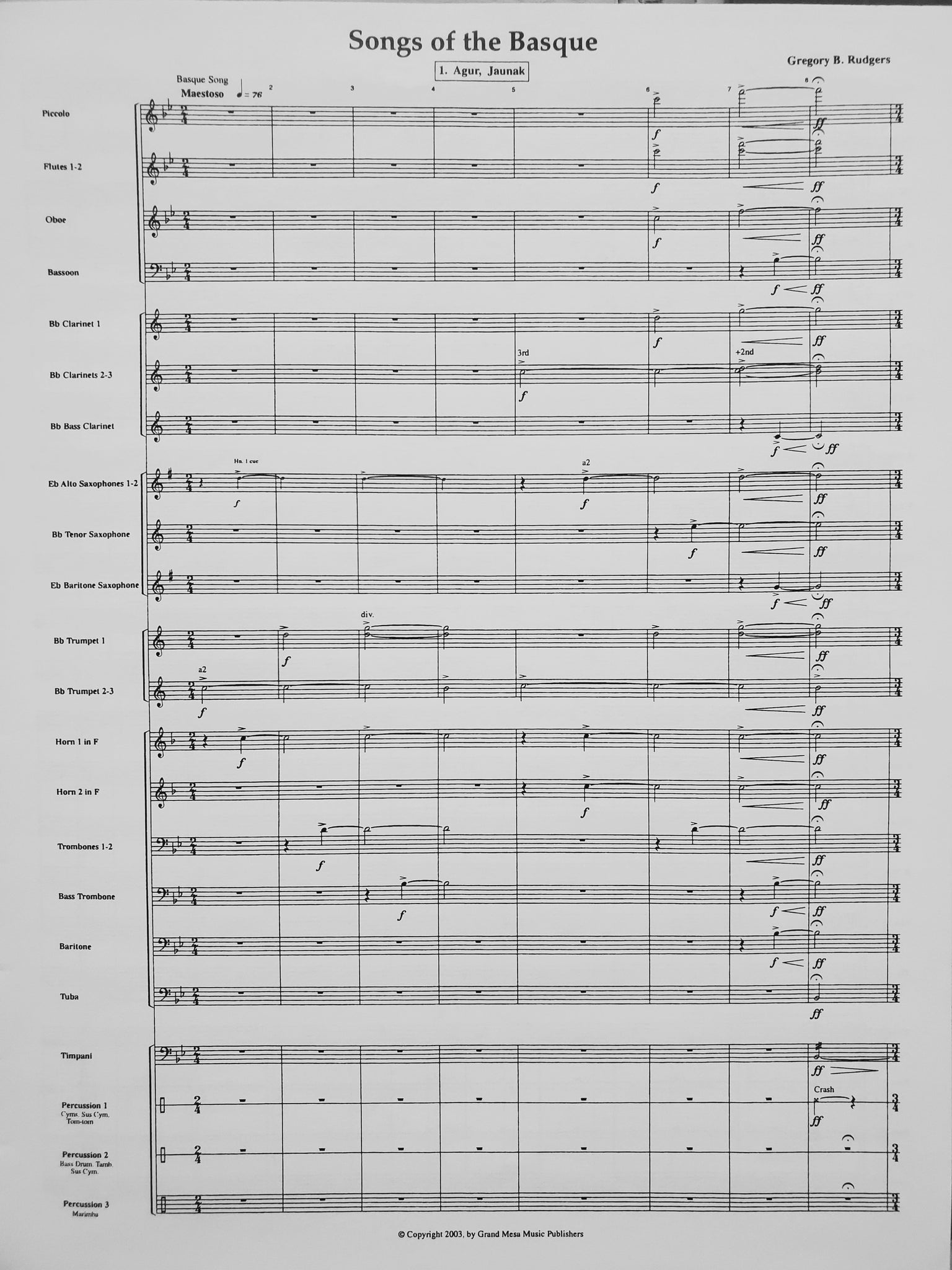 Instrumentation: score; 1-piccolo; 8-flute 1 and 2; 2-oboe; 2-bassoon; 4-clarinet 1; 4-clarinet 2; 4-clarinet 3; 2-bass clarinet; 4-alto sax 1 and 2; 2-tenor sax; 1-bari sax; 3-trumpet 1; 3-trumpet 2; 3-trumpet 3; 2-horn 1; 2-horn 2;4-trombone 1 and 2; 2-bass trombone; 2-baritone BC; 2-baritone TC; 4-tuba; 1-timpani; 2-percussion 1; 3-percussion 2; 2-percussion 3