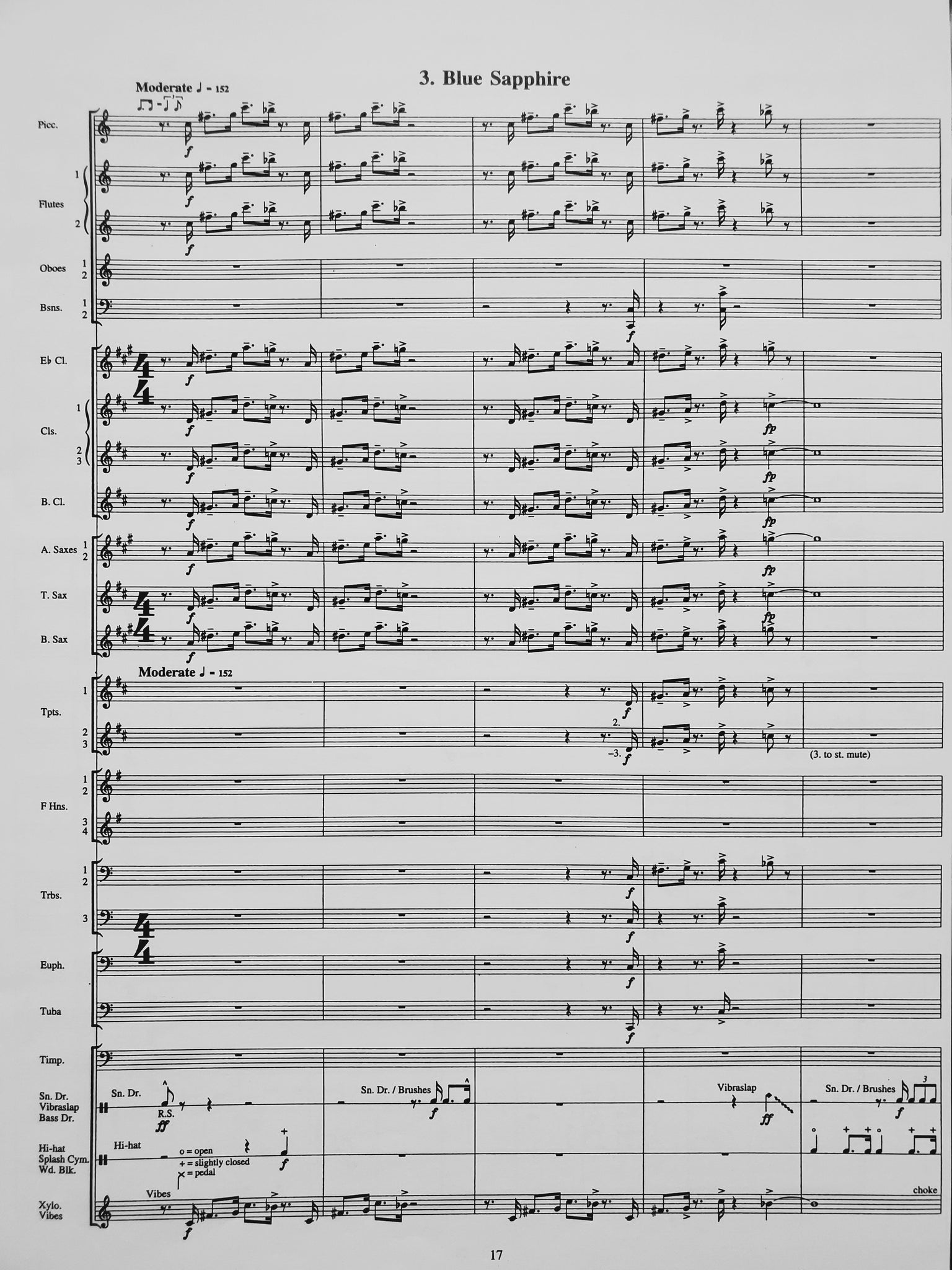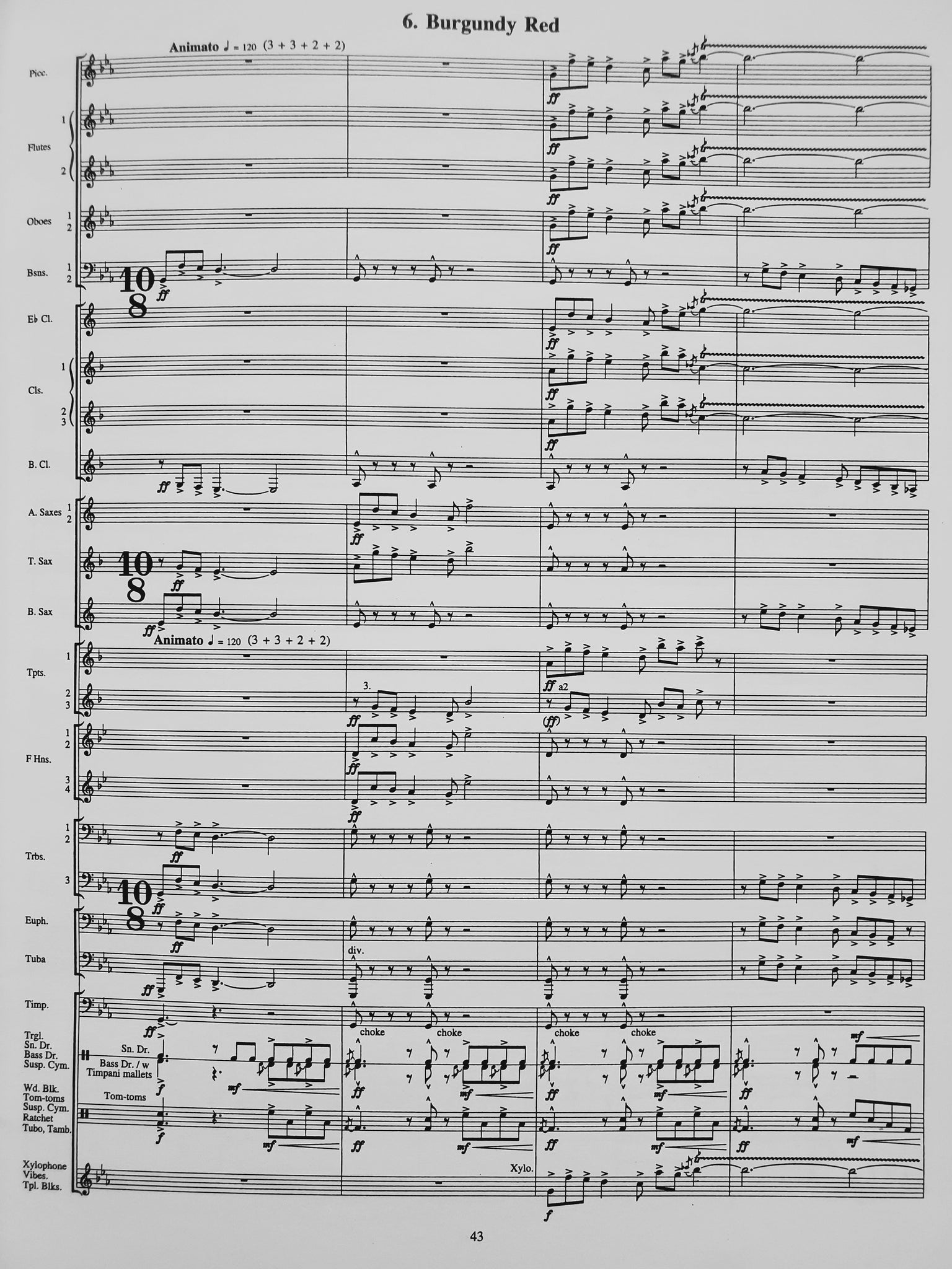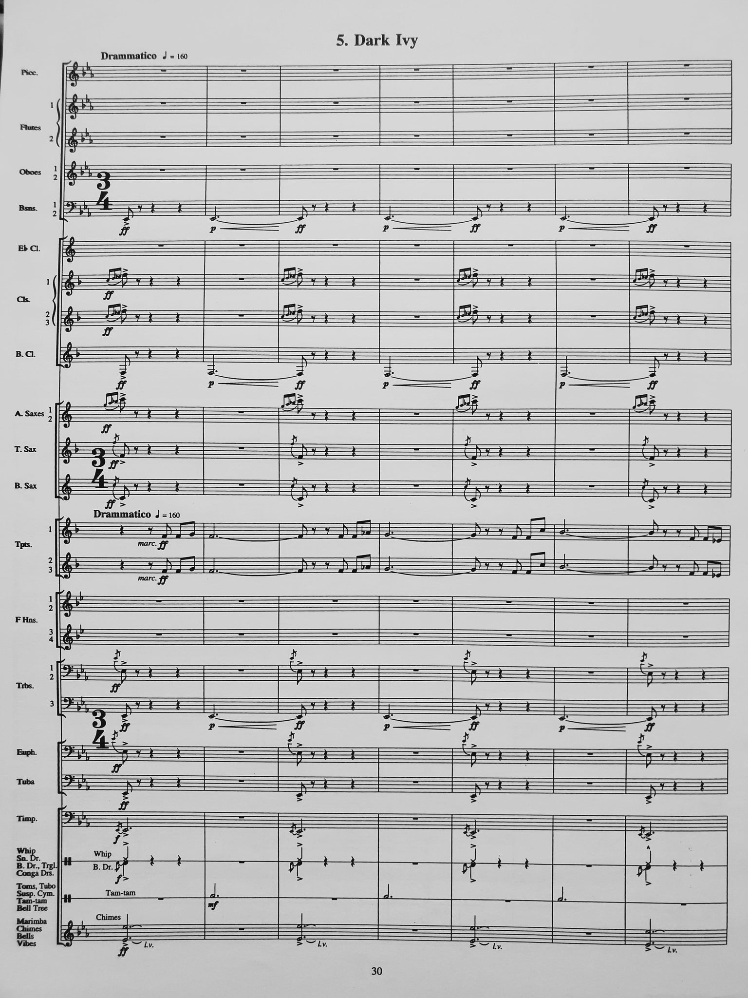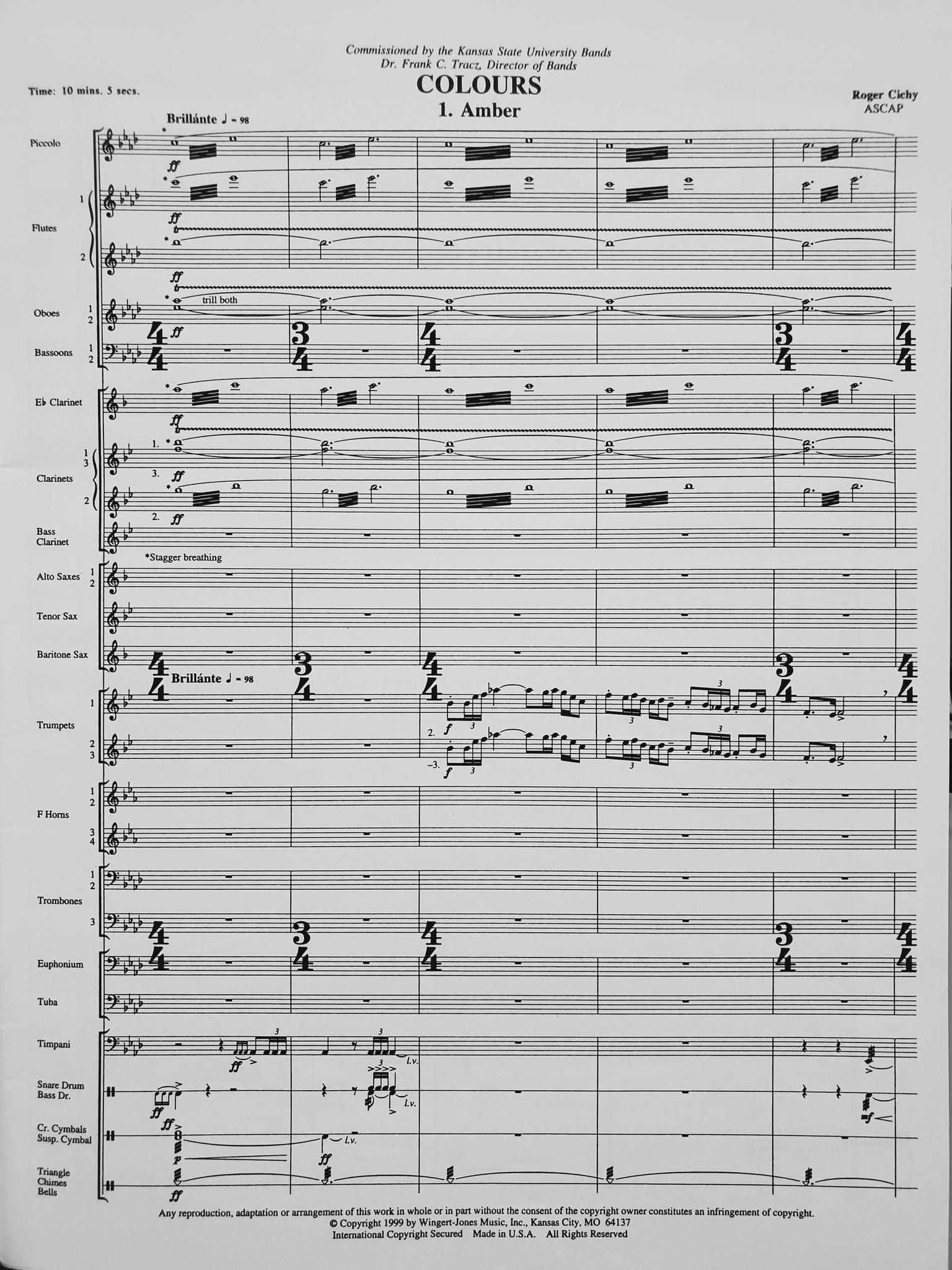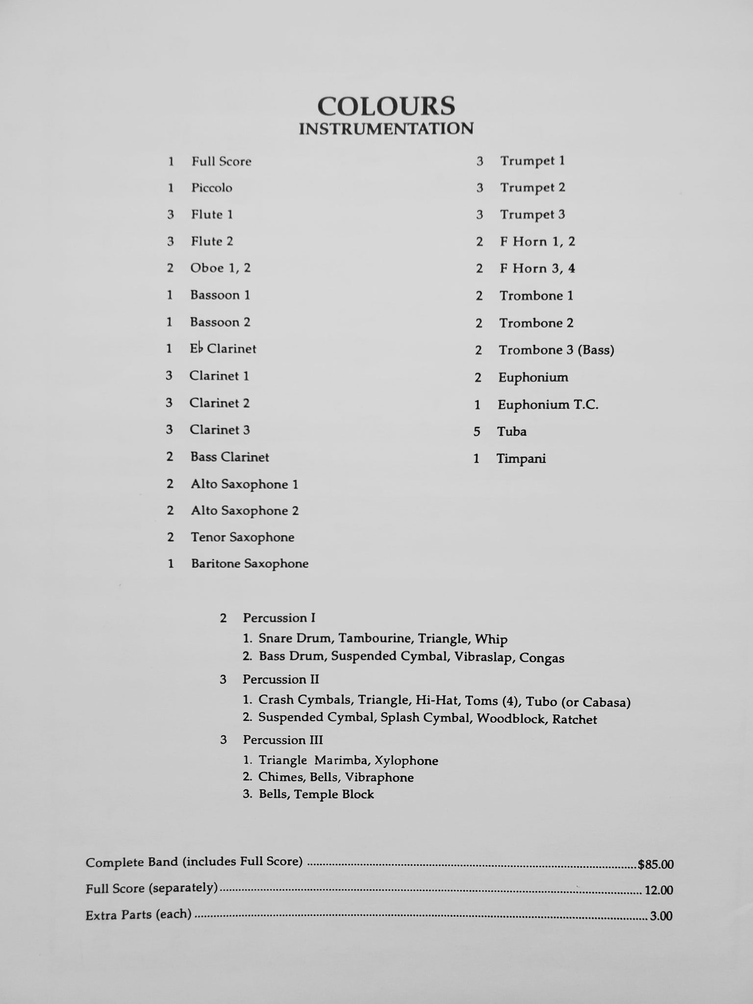 Instrumentation: score; 1-piccolo; 3-flute 1; 3-flute 2; 2-oboe 1 and 2; 1-bassoon 1; 1-bassoon 2; 1-Eb clarinet; 3-clarinet 1; 3-clarinet 2; 3-clarinet 3; 2-bass clarinet; 2-alto sax 1; 2-alto sax 2; 2-tenor sax; 1-bari sax; 3-trumpet 1; 3-trumpet 2; 3-trumpet 3; 2-horn 1 and 2; 2-horn 3 and 4; 2-trombone 1; 2-trombone 2; 2-trombone 3; 2-euphonium; 1-euphonium TC; 5-tuba; 1-timpani; 2-percussion 1; 3-percussion 3; 3-percussion 3