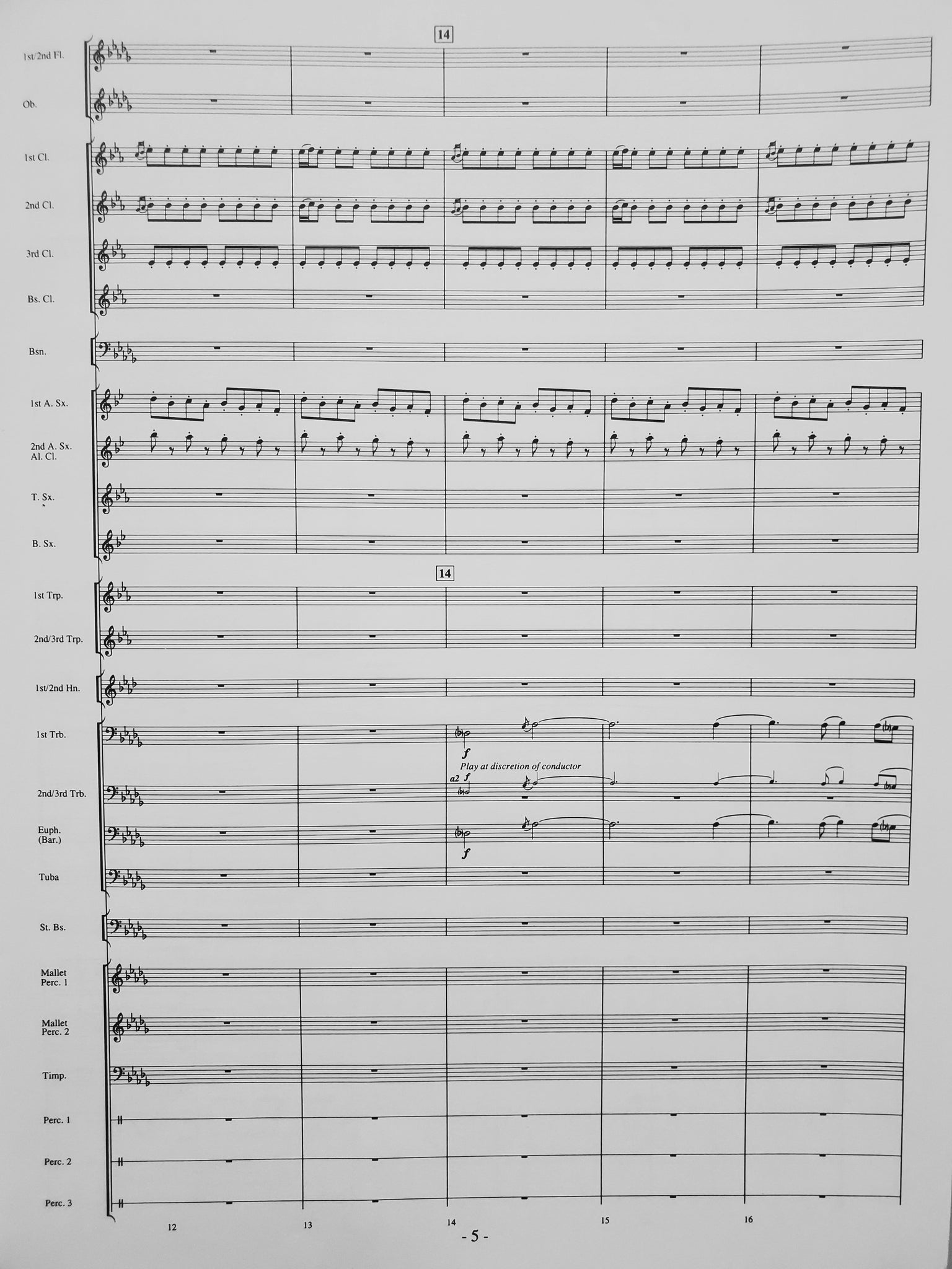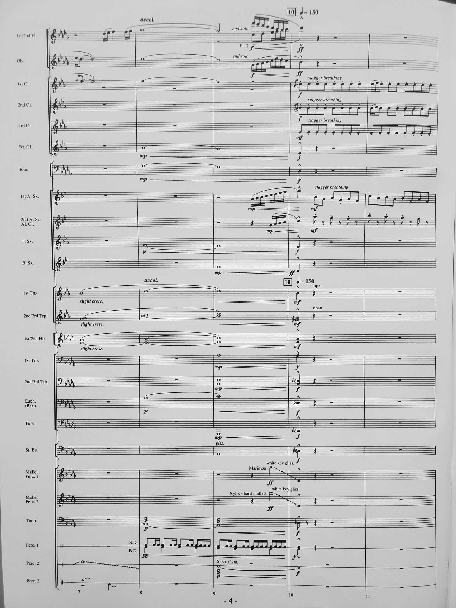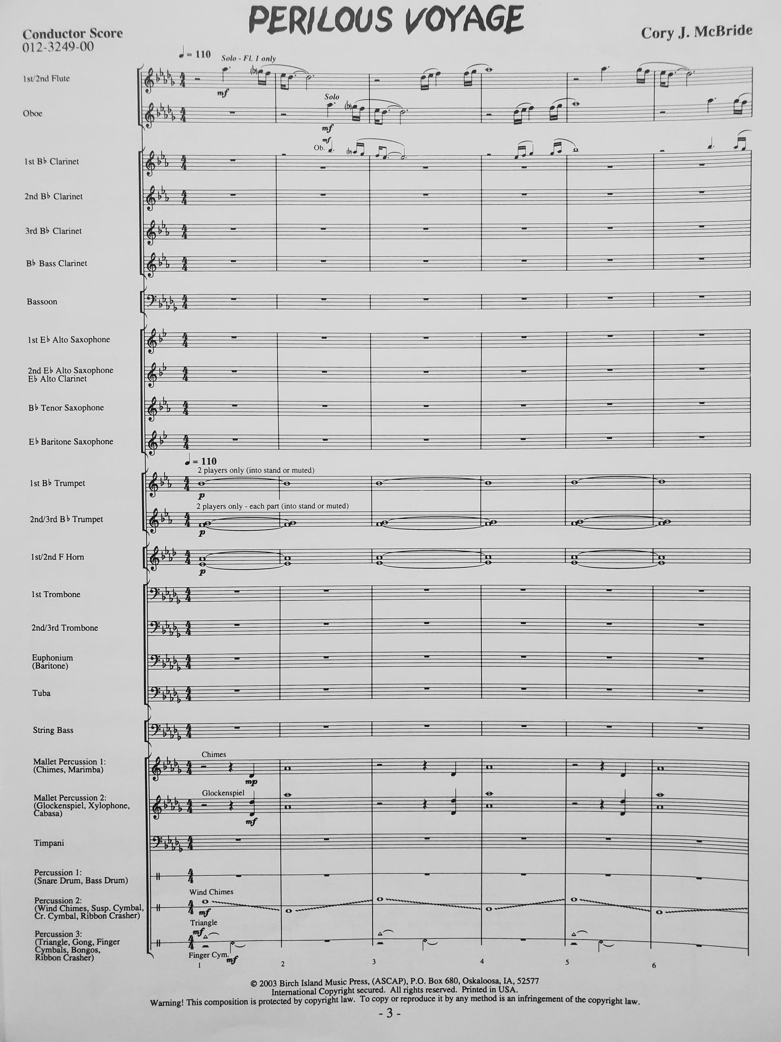 Instrumentation: score; 5-flute 1; 5-flute 2; 2-oboe; 4-clarinet 1; 4-clarinet 2; 4-clarinet 3; 2-bass clarinet; 2-bassoon; 3-alto sax 1; 3-alto sax 2/alto clarinet; 2-tenor sax; 1-bari sax; 3-trumpet 1; 3-trumpet 2; 3-trumpet 3; 4-horn 1 and 2; 2-trombone 1; 2-trombone 2; 2-trombone 3; 2-baritone BC; 2-baritone TC; 4-tuba; 1-string bass; 1-mallet percussion 1; 2-mallet percussion 2; 1-timpani; 2-percussion 1; 3-percussion 2; 3-percussion 3