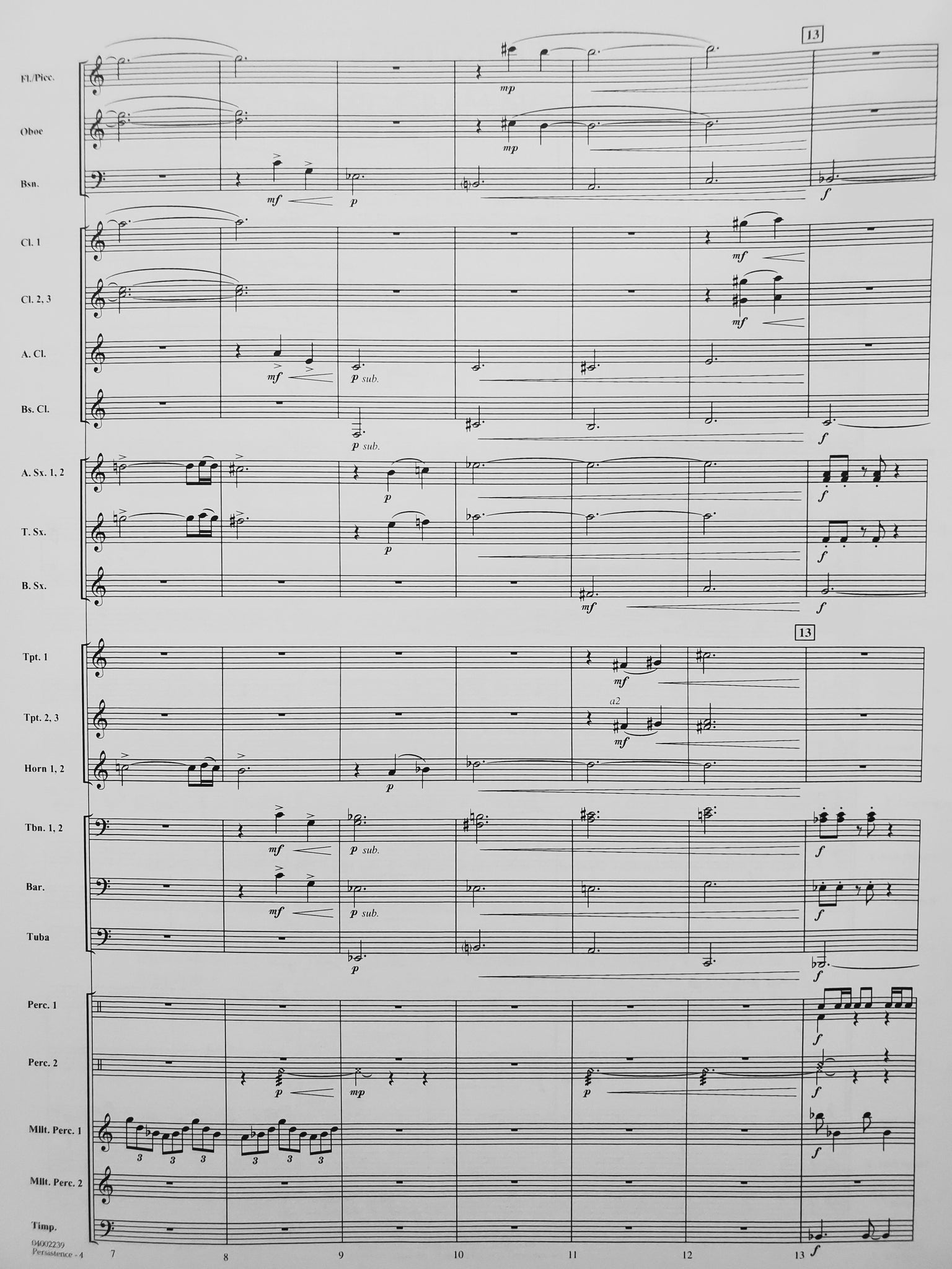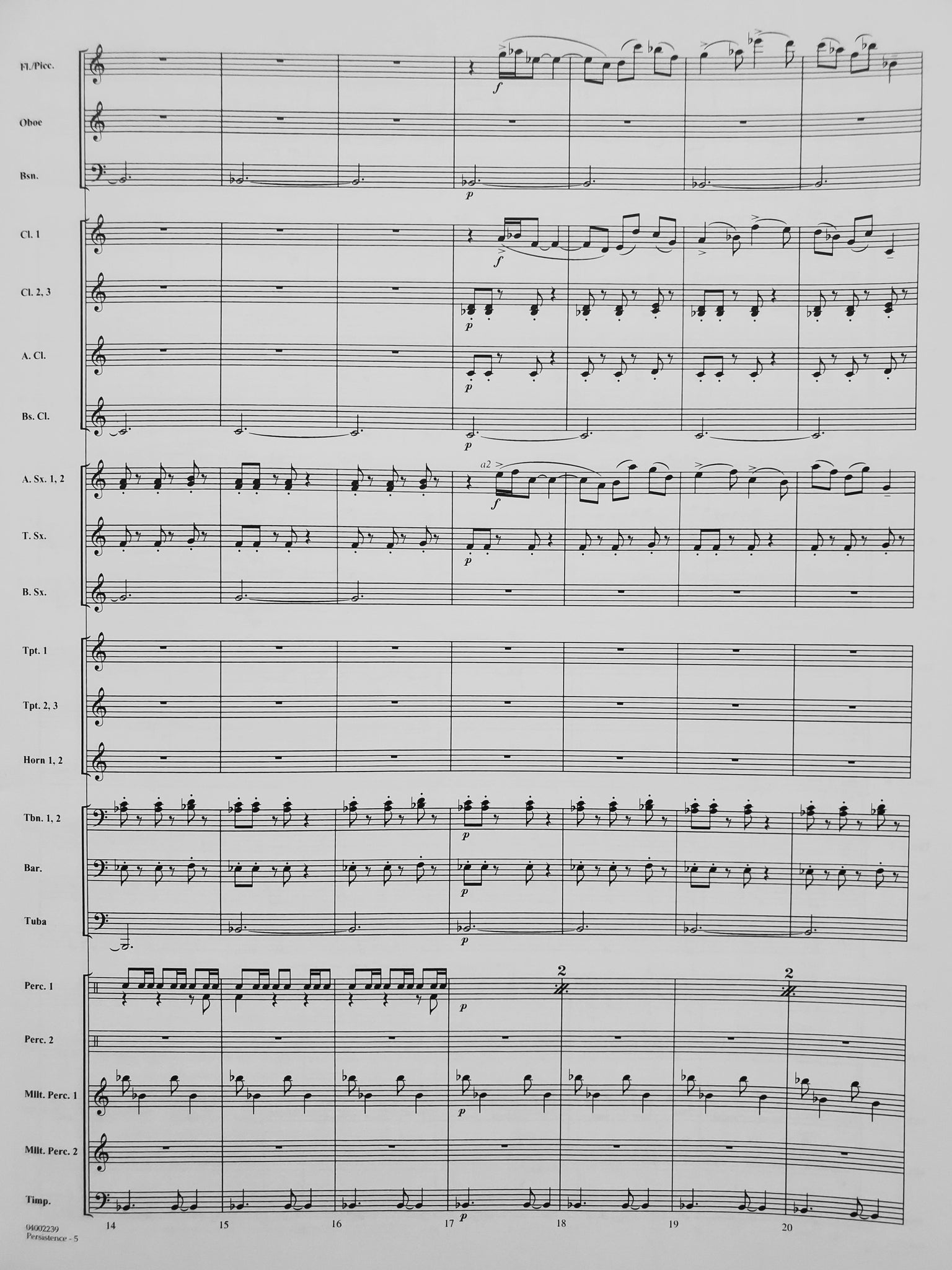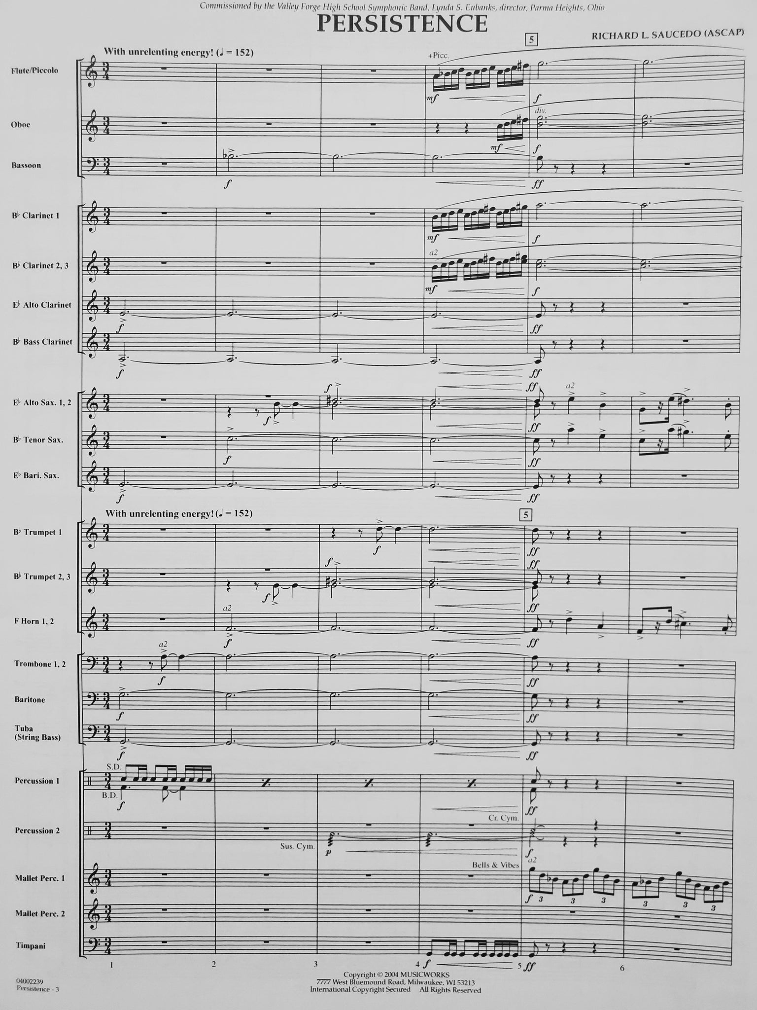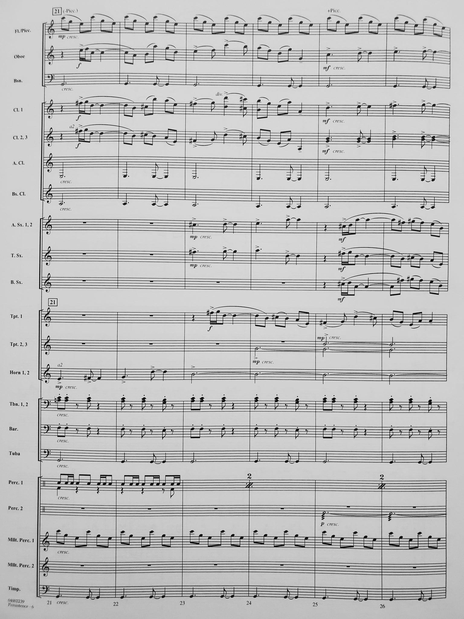 Instrumentation: score; 1-piccolo; 8-flute; 2-oboe; 2-bassoon; 4-clarinet 1; 4-clarinet 2; 4-clarinet 3; 1-alto clarinet; 2-bass clarinet; 2-alto sax 1; 2-alto sax 2; 2-tenor sax; 1-bari sax; 3-trumpet 1; 3-trumpet 2; 3-trumpet 3; 2-horn 1; 2-horn 2; 3-trombone 1; 3-trombone 2; 3-trombone 3; 2-baritone BC; 2-baritone TC; 4-tuba; 1-string bass; 2-percussion 1; 2-percussion 2; 2-mallet percussion 1; 2-mallet percussion 2; 1-timpnai