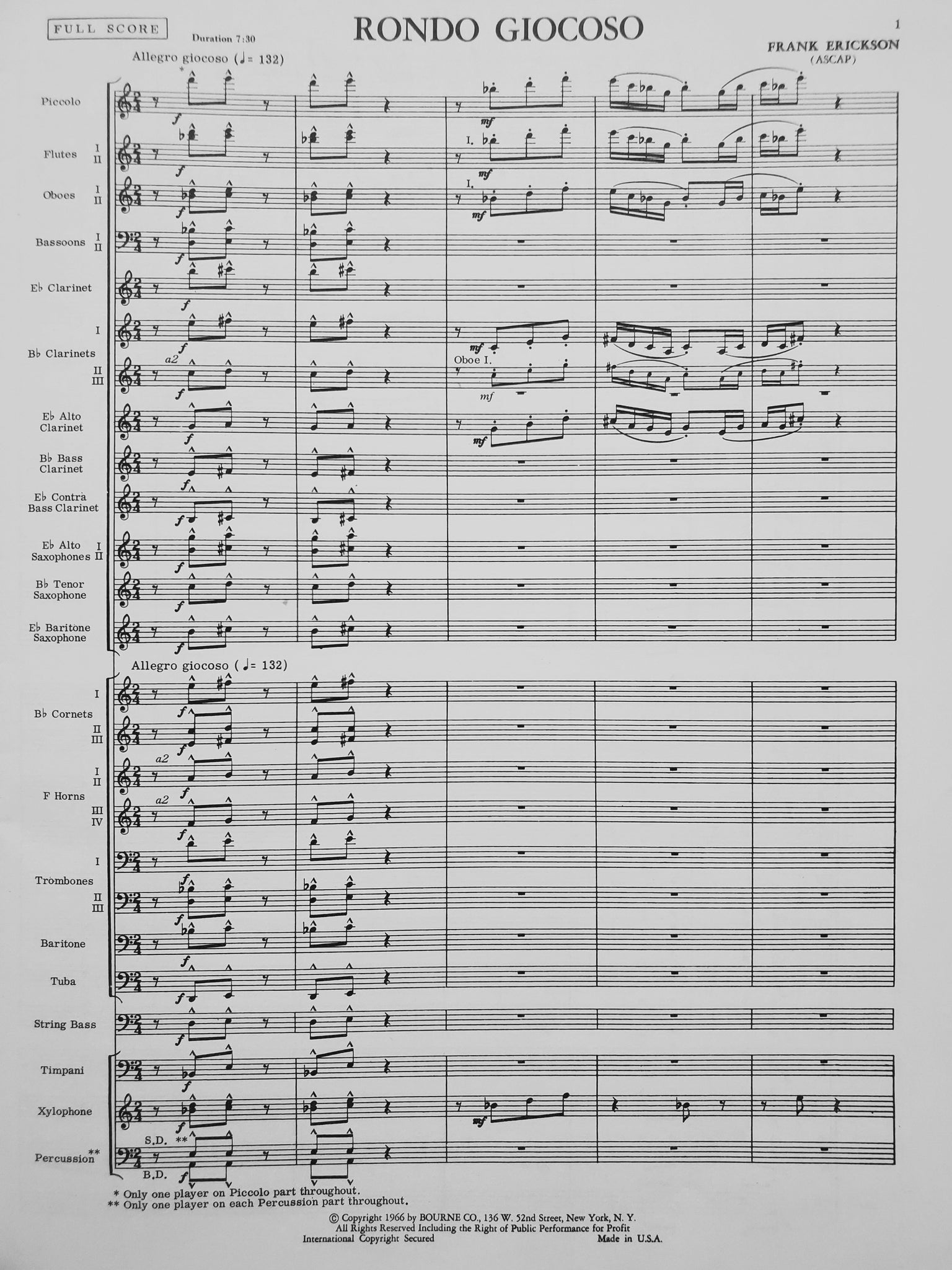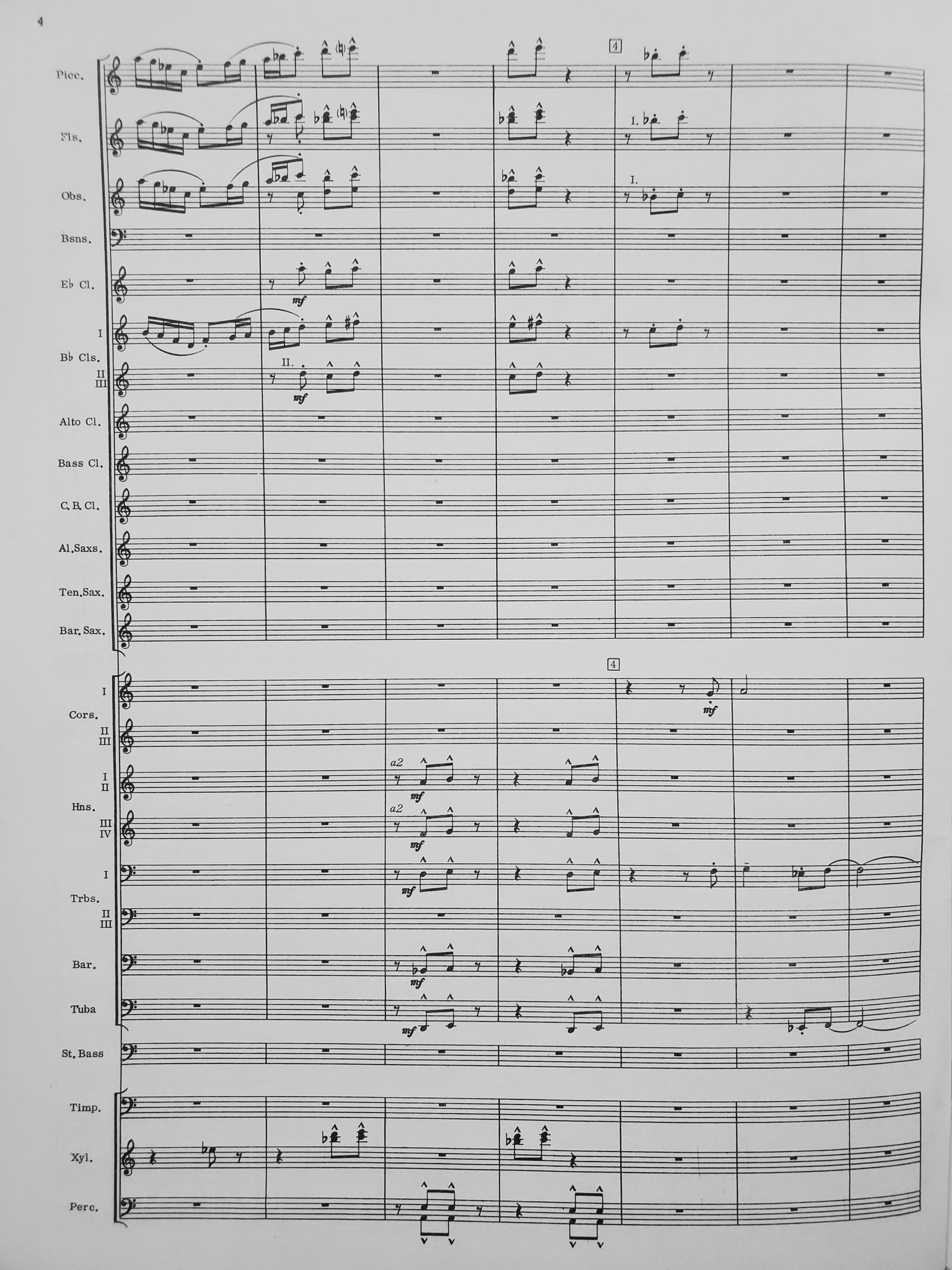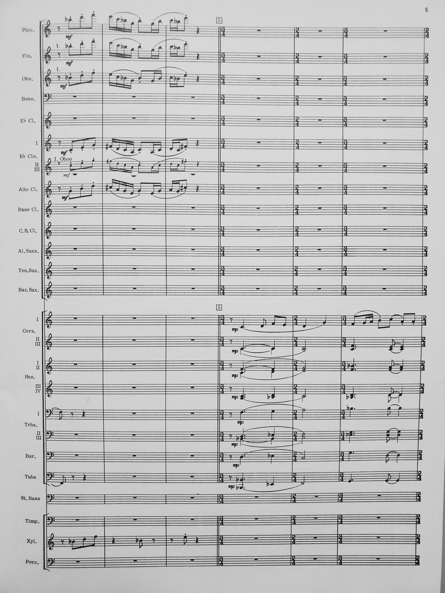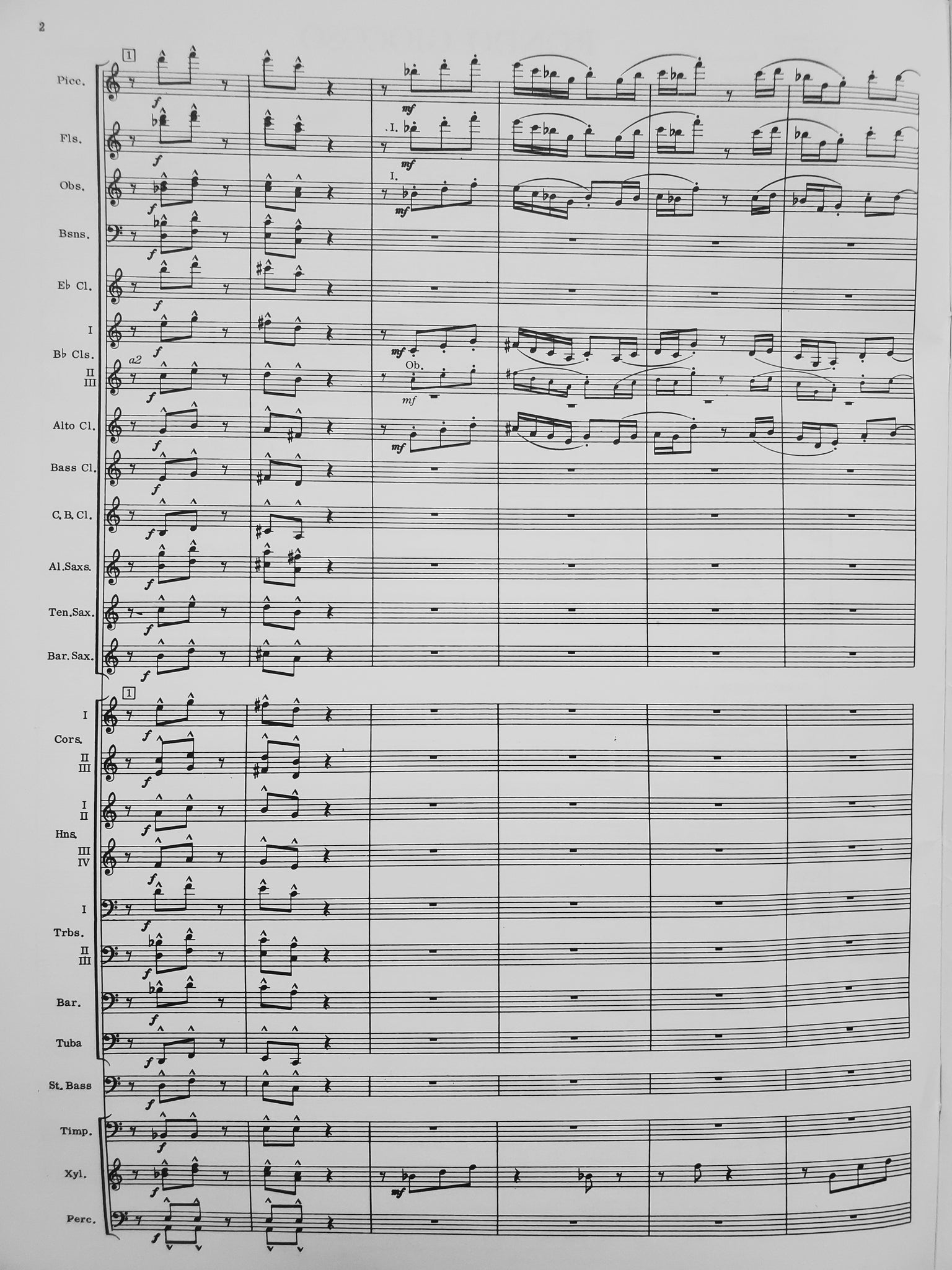 Instrumentation: full score; conductor score; 1-piccolo; 3-flute 1; 3-flute 2; 1-oboe 1; 1-oboe 2; 1-bassoon 1; 1-bassoon 2; 1-Eb clarinet; 4-clarinet 1; 4-clarinet 2; 4-clarinet 3; 2-alto clarinet; 2-bass clarinet; 1-Eb contrabass clarinet; 1-BBb contrabass clarinet; 1-alto sax 1;1 1-alto sax 2; 1-tenor sax; 1-bari sax; 3-cornet 1; 3-cornet 2; 3-cornet 3; 1-horn 1; 1-horn 2; 1-horn 3; 1-hotn 4; 2-trombone 1; 1-trombone 2; 1-trombone 3; 2-baritone TC; 2-baritone BC; 6-tuba; 1-string bass; 1-timpani; 3-percussion 1; 1-percussion 2