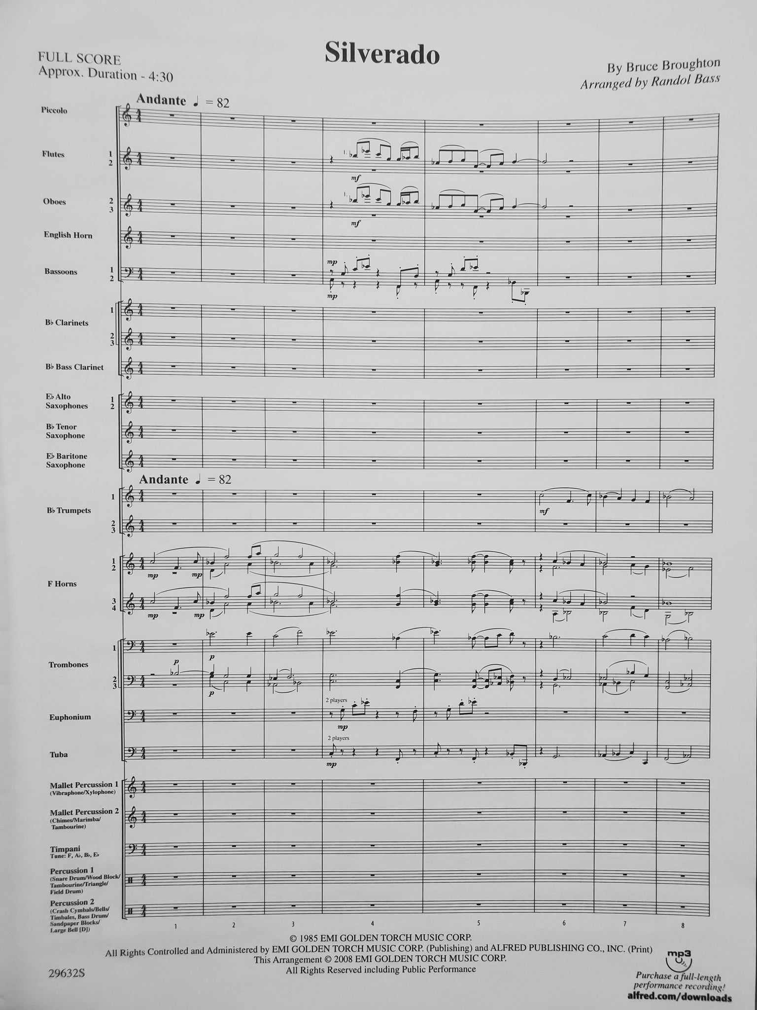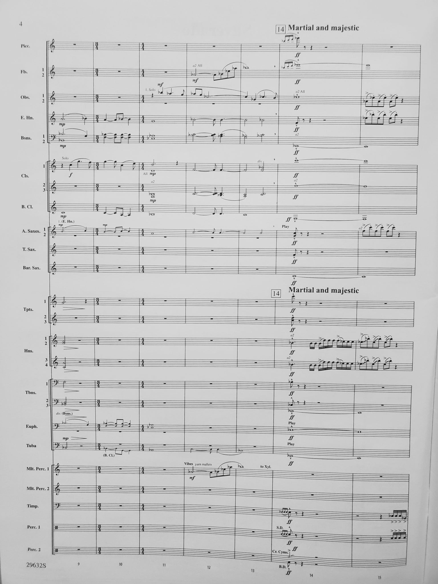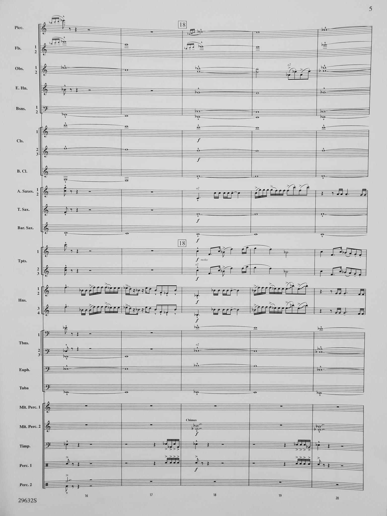 Instrumentation: score; 1-piccolo; 3-flute 1; 3-flute 2; 1-oboe 1; 1-oboe 2; 1-english horn; 1-bassoon 1; 1-bassoon 2; 3-clarinet 1; 3-clarinet 2; 3-clarinet 3; 2-bass clarinet; 2-alto sax 1; 2-alto sax 2; 1-tenor sax; 1-bari sax; 3-trumpet 1; 3-trumpet 2; 3-trumpet 3; 1-horn 1; 1-horn 2; 1-horn 3; 1-horn 4; 2-trombone 1; 2-trombone 2; 2-trombone 3; 2-euphonium; 1-baritone TC; 4-tuba; 2-mallet percussion 1; 3-mallet percussion 2; 1-timpani; 3-percussion 1; 4-percussion 2