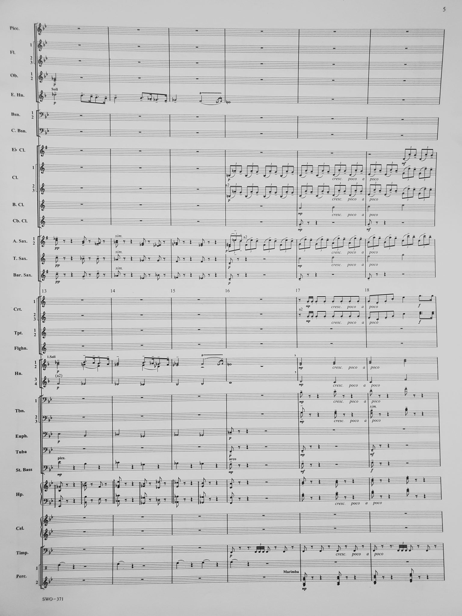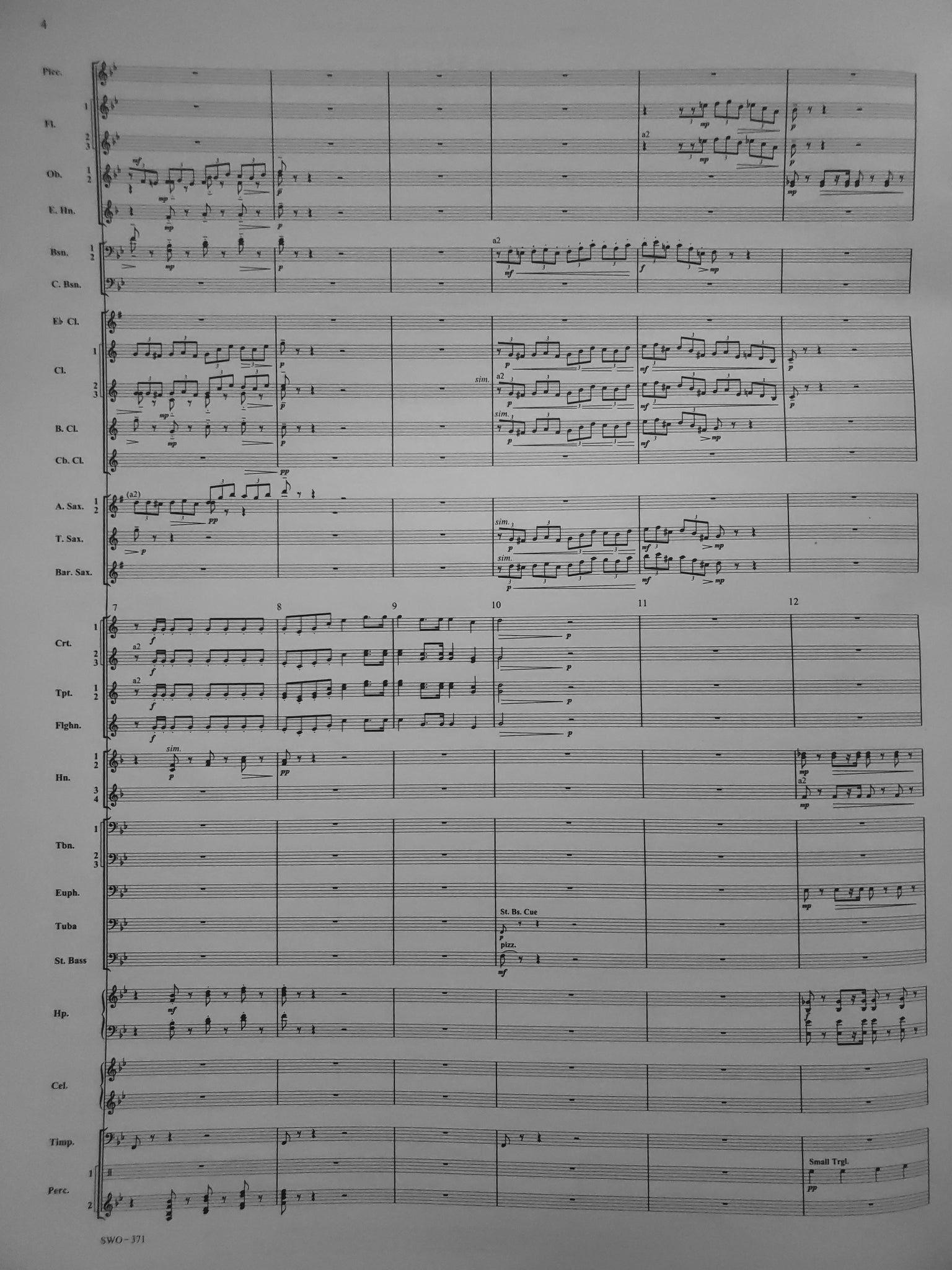 score; 1-piccolo; 2-flute 1; 2-flute 2 and 3; 1-oboe 1; 1-oboe 2; english horn; bassoon 1; bassoon 2; contrabassoon; Eb clarinet; 3-clarinet 1; 3-clarinet 2; 3-clarinet 3; 2-bass clarinet; Bb contrabass clarinet; alto sax 1; alto sax 2; tenor sax; bari sax; 2-cornet 1; 2-cornet 2; 2-cornet 3; trumpet 1; trumpet 2; Eb flugelhorn; horn 1; horn 2; horn 3; horn 4; 2-trombone 1; 2-trombone 2; 2-trombone 3; 3-euphonium; 3-tuba; 1-string bass; harp; celesta/piano; timpani; 2-percussion 1; 2-percussion 2